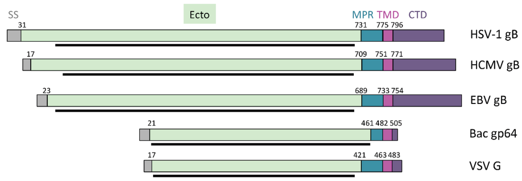 Between the ectodomain and the TMD lies a stretch of 43 amino acids termed the membrane-proximal region (MPR) (Figure 4). Approximately 40% of the residues within the MPR are conserved among alphaherpesviruses, and some of these are invariant among all herpesviruses. Mutation of this highly conserved subset in HSV-1 gB yields viruses with negligible infectivity []. The MPR is predicted to be helical and, due to its highly hydrophobic character, probably interacts with the membrane. It may form a pedestal beneath the ectodomain, similarly to the stem-loop region in flavivirus E []. In E, a class II fusogen, the MPR folds separately from the ectodomain in the prefusion form but becomes an integral part of the postfusion structure, forming the outer layers of the trimeric hairpin []. Since the gB MPR is not a part of the postfusion hairpin [], it may participate in fusion differently from other MPRs.