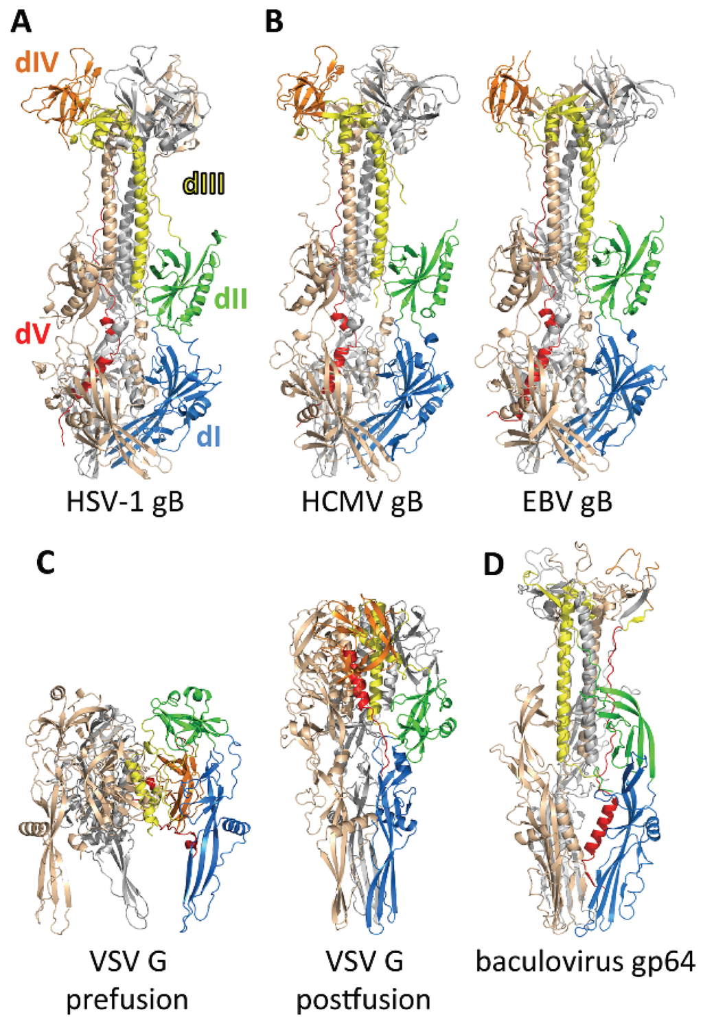 The crystal structures of class III viral fusogens. HSV-1 gB (PDB ID 2GUM), CMV gB (PDB ID 5CXF), EBV gB (PDB ID 3FVC), and baculovirus gp64 (PDB ID 3DUZ) are shown in the postfusion conformations. VSV G is shown in both prefusion and postfusion conformations (PDB ID 2J6J and 2CMZ). A single protomer is each structure is colored by domain: dI, blue; dII, green; dIII, yellow; dIV, orange, and dV, red. The other two protomers are shown in gray and wheat, for ease of comparison. Figure was made with Pymol.