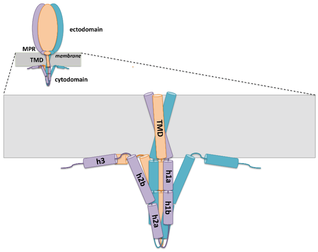 A model of the HSV-1 gB. Both the entire protein and a close-up view of the TMD and the CTD are shown. The ectodomain and the MPR regions are represented by ovals of different sizes. TMD helices are shown in a funnel configuration, one possible way in which they may be arranged. The CTD has a proteolytically resistant core and is predicted to contain three helices: h1, h2, and h3. These may be intact or interrupted by short linkers (as shown). Helices h2 and h3 are thought to interact with the membrane.