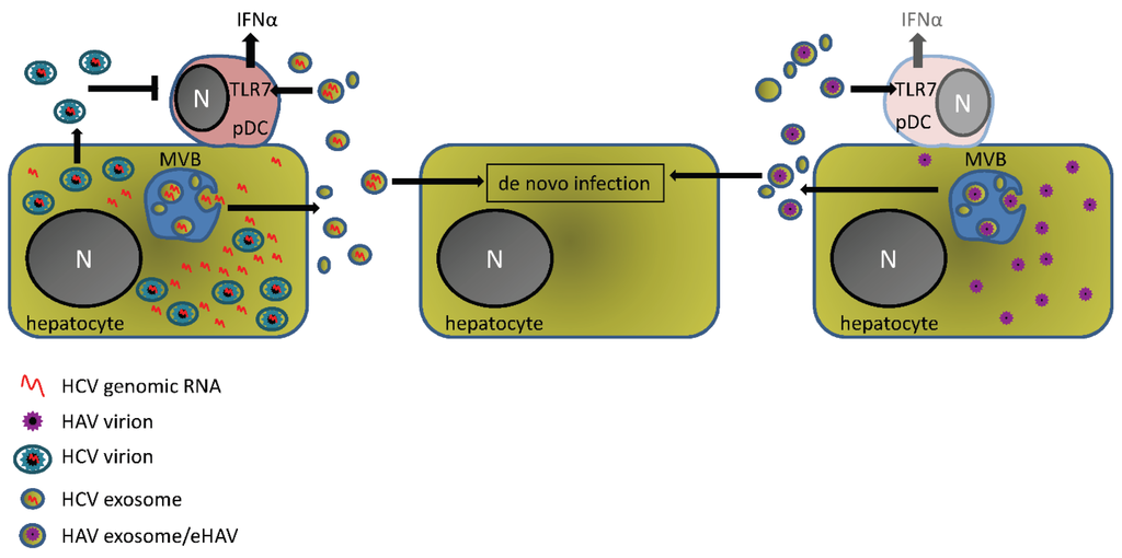 HCV infection on the other hand leads to sustained inflammation of the liver characterized by induction of type I and type-III interferons and an abundance of pDCs. Cell culture experiments using subgenomic replicon cells suggest that exosomal HCV infection is inefficient compared to free virus infection [25]. The contribution of exosomal HCV vs. free virus infection in vivo is difficult to determine since, unlike HAV, the viral particles exhibit a similar size and density to viral exosomes and contamination of exosome preparations with free virus is difficult to exclude. However, using an immune-isolation protocol to try and largely separate virus from viral exosomes Bukong et al., show that HCV-exosomes can be found in the circulation of infected patients and that these vesicles are infectious and largely resistant to neutralization by anti-HCV-E2 antibodies [26,27]. It is possible that these HCV-exosomes constitute an immune-protected viral reservoir that allows the virus to persist after antiviral treatment or liver transplantation whereas the main spread of infection in the liver occurs via free HCV virus.