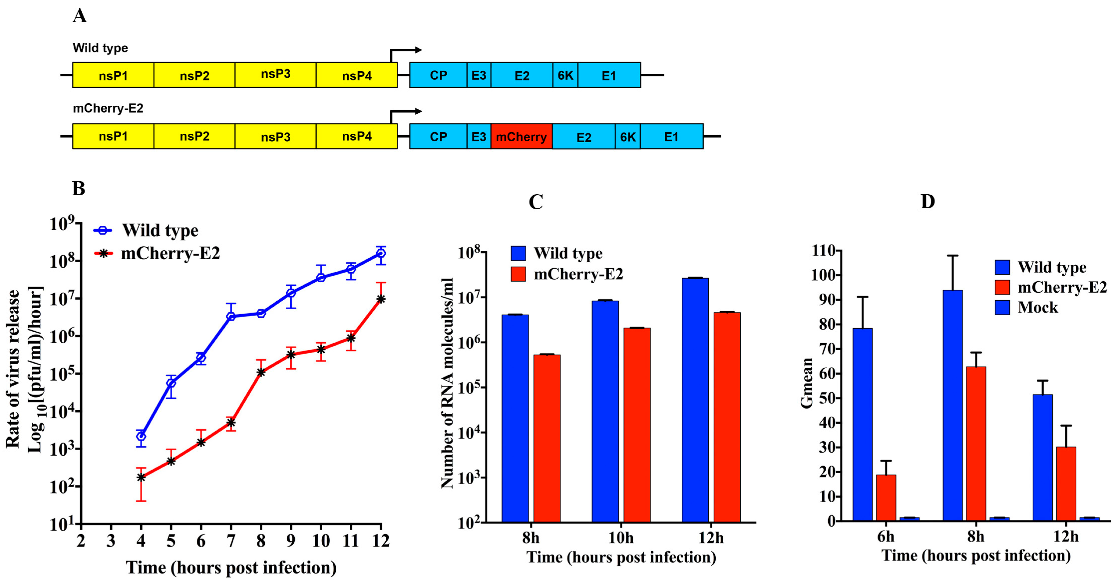 Construction and characterization of mCherry-tagged virus. (A) Schematic of wild-type (WT) and mCherry-E2 Sindbis virus (SINV) complementary DNA (cDNA) clones; (B) One-step growth curve analysis of WT and mCherry-E2 virus released from Baby Hamster Kidney fibroblast (BHK) cells. BHK cells were infected with WT or mCherry-E2 viruses at a multiplicity of infection (MOI) of 5 and media were changed every hour for 12 h and the rate of virus release (plaque-forming unit (pfu) per ml per hour) was determined using standard plaque assays; (C) Quantitation of the number of viral RNA molecules (corresponding to virus particles released into the media) for WT and mCherry-E2 mutant viruses at 8, 10, and 12 h. Total number of genome RNA molecules was determined by quantitative real-time reverse transcription PCR (qRT-PCR) using a standard curve of known amount of in vitro transcribed SINV RNA molecules; (D) Determination of E2 surface expression in BHK cells infected with WT or mCherry-E2 virus by flow cytometry using anti-E2 monoclonal antibody at 6, 8, and 12 h post-infection (p.i). Y-axis is represented by Gmean, which corresponds to the geometric mean of the fluorescence data calculated by averaging the log of the fluorescence and the scale value of that average in fluorescence units.