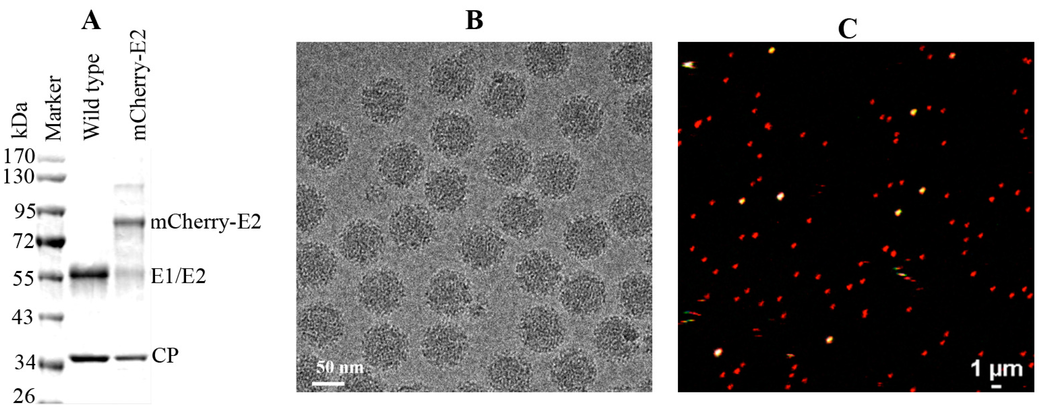 (A) Sodium dodecyl sulfate polyacrylamide gel electrophoresis (SDS-PAGE) analysis of purified WT and mCherry-E2 virus showing the size difference of mCherry protein tagged to the E2 and WT E2 protein; (B) Cryo-electron microscopy (CryoEM) of purified mCherry-E2 virus exhibiting uniform spherical morphology; (C) Confocal merged image of purified mCherry-E2 virus mixed with tetra speck beads (100 nm size fluorescent microspheres fluoresce in green, red, and blue channels, seen as white dots when merged) demonstrating that the individual virions can be observed by confocal live imaging.