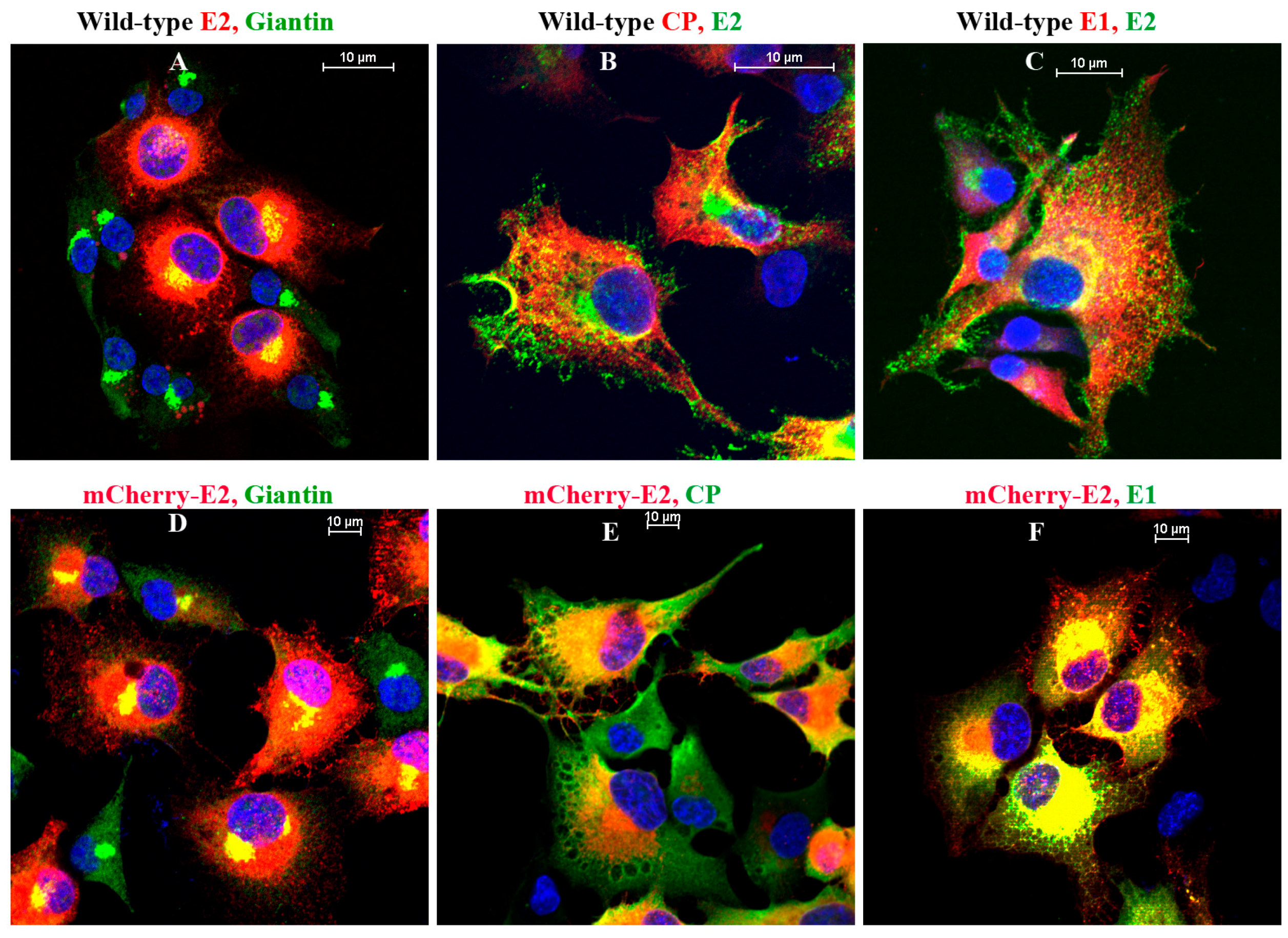 Immunofluorescence (IF) analysis of WT (A–C) and mCherry-E2 virus-infected BHK cells (D–F) showing the distribution of viral proteins. Cells infected with WT or mCherry-E2 viruses were subjected to IF analysis at 6 h p.i. with antibodies against rabbit polyclonal Giantin (Golgi), rabbit polyclonal anti-CP, rabbit polyclonal anti-E1, and mouse monoclonal anti-E2 primary antibodies and labeled with fluorescein isothiocyanate (FITC)- or tetramethylrhodamine (TRITC)-labeled goat anti-rabbit and goat anti-mouse secondary antibodies.