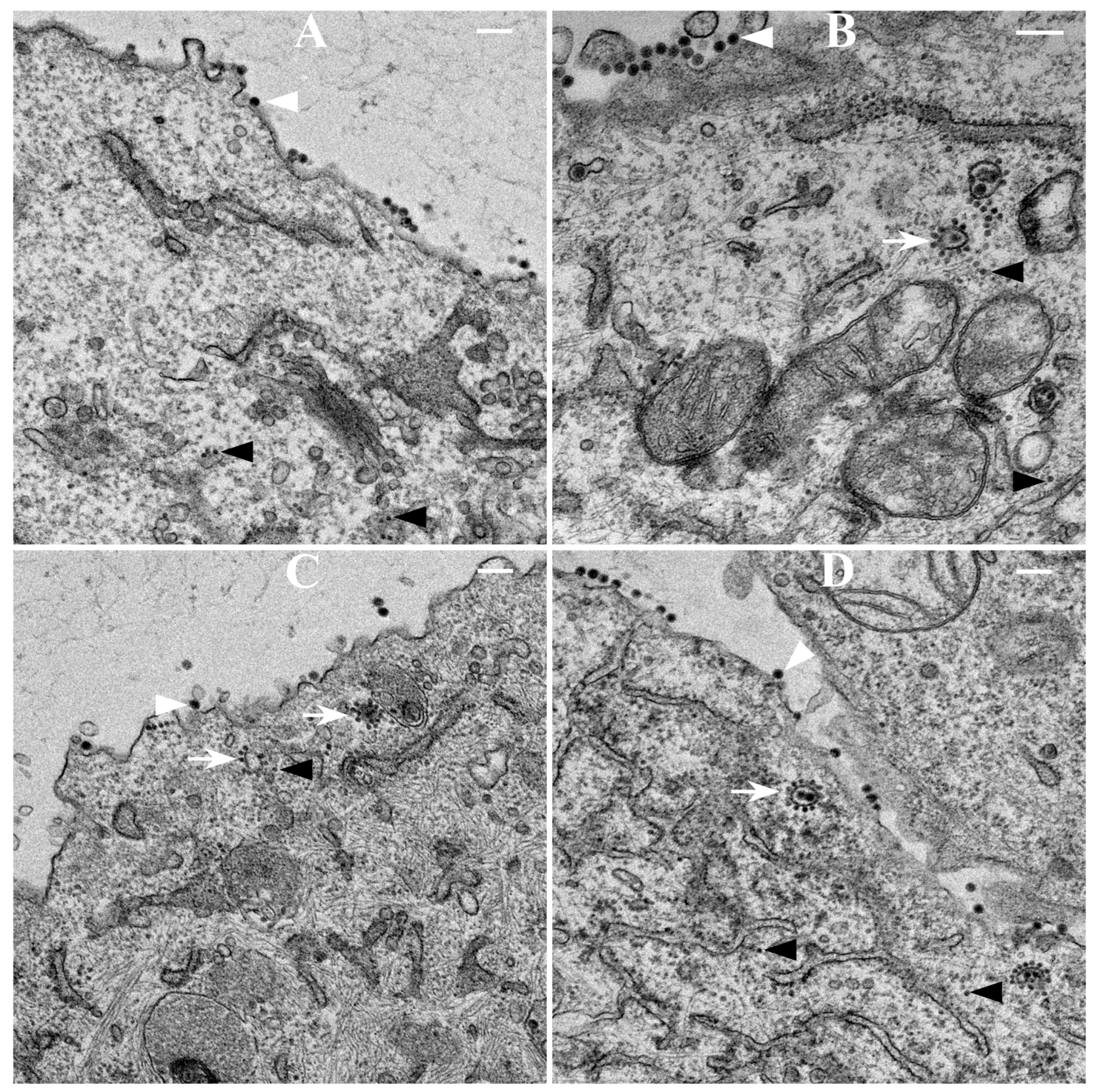 Thin sections of BHK cells infected with WT SINV at 6 h p.i. (Figure 7A) and 12 h p.i. (Figure 7B) and mCherry-E2 SINV at 6 h p.i. (Figure 7C) and 12 h p.i. (Figure 7D) showed the presence of NCs, budding viruses, and released virions. CPV-IIs with NCs attached to the outer lipid bilayers were seen in the cytoplasm (Figure 7B,D). Virus budding occurred predominantly from the PM. When compared to 6 h p.i., CPV-IIs were abundant at 12 h p.i. (Figure 7B,D). Virus budding is associated with filopodial extensions and filopodia were observed in mCherry-E2 virus-infected BHK cells at 12 h p.i. (Figure S2). Overall, mCherry-E2 virus-infected cells were indistinguishable from WT SINV-infected cells. CPV-II and virus budding from the PM were observed from both types of virus-infected cells, suggesting that these processes were not affected by the presence of the fluorescent protein tag on the mCherry-E2 virus.