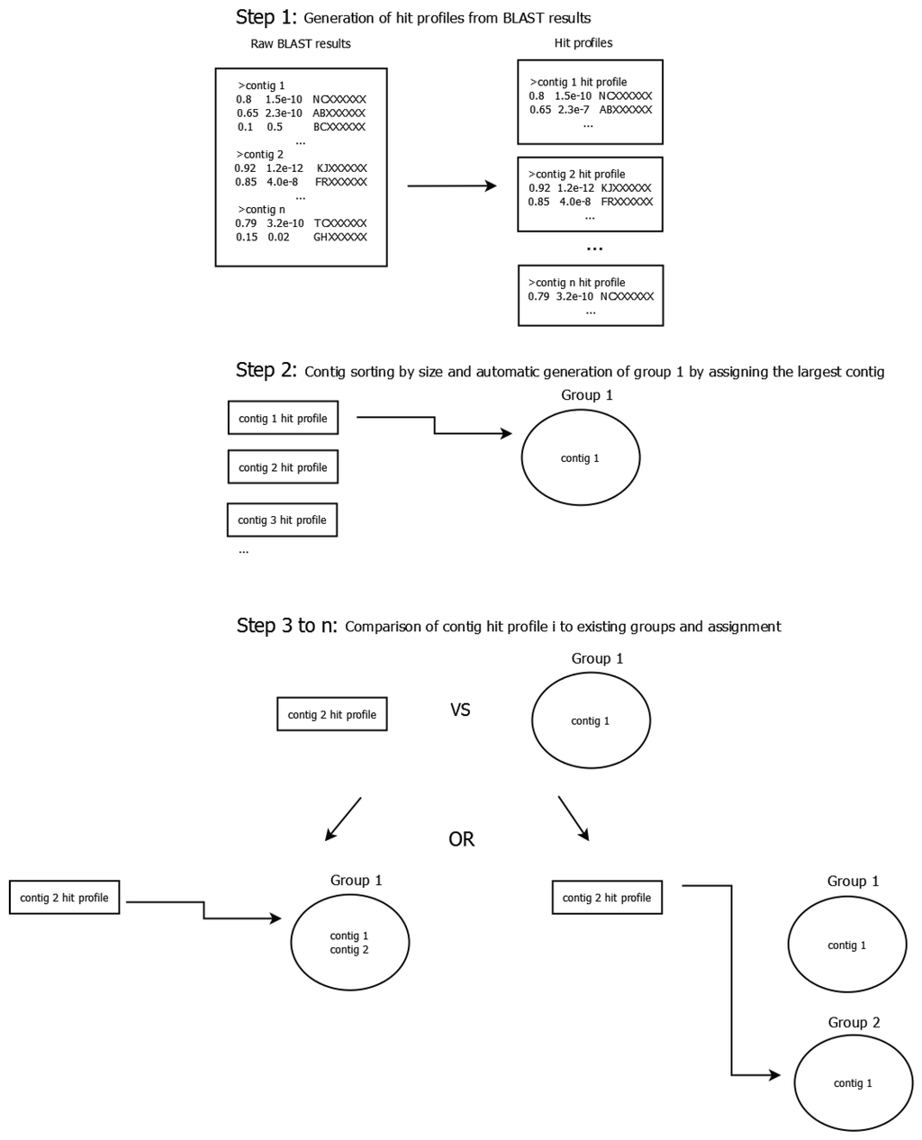 Schematic illustrating the contig grouping process. In a first step, a BLAST search against the non-redundant nucleotide collection is performed for all contigs. Afterwards, a hit profile is generated for each contig by applying a cutoff of 20% on the query coverage and 1 × 10−10 on the E-value to the raw BLAST results. During the second step contigs are sorted by size and the largest contig is automatically assigned to group 1. The third step consists of comparing the second-largest contig to all existing groups using the scoring system described in the text and either assigning the contig to the group with the lowest distance score or opening a new group if the lowest score is greater than 0.9. It is repeated until all contigs have been assigned (though some contigs may be the only member of their respective group).