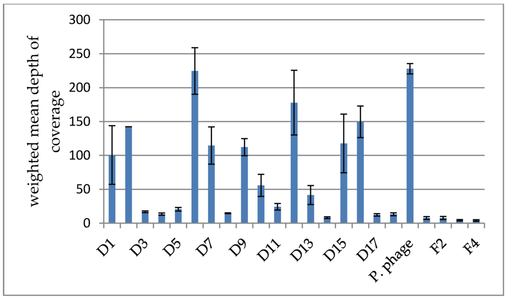 As was the case in the unamplified cocktail, the depth of coverage varied between contigs belonging to the same phage cluster in the host-amplified samples. This could signify a bias for amplification of only certain parts of the cluster. On the other hand, chimeric vs. non-chimeric contigs can also cause a variation in depth within a cluster (see Section 3.2.2).