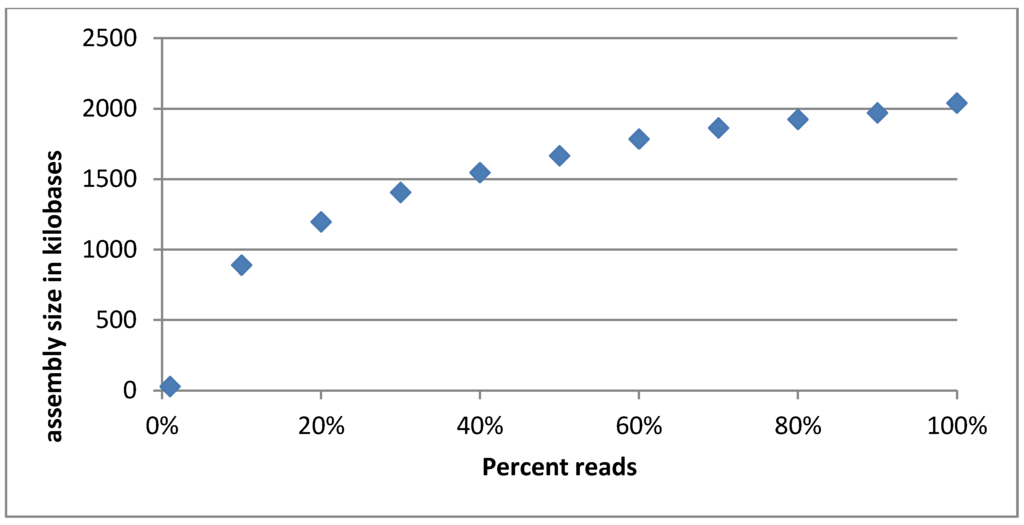 A rarefaction curve was made by assembling discreet fractions of the quality trimmed reads and plotting the total assembly size vs. the fraction of reads used. The reasoning behind this was that if the phage cocktail has been sequenced sufficiently deeply, the assembly size will converge as more reads will add depth to the existing contigs instead of creating new ones. This behavior was indeed observed (compare Figure 3). It can be seen that the rarefaction curve is not completely flattened out, indicating that there may be rare phages not represented in the reads. Still, we reason that while the sample is not sequenced to its entire diversity we have succeeded in covering the majority of the phages present. Furthermore, when re-mapping reads to the finished assembly, 425,960 (97%) of the 440,392 reads map properly.