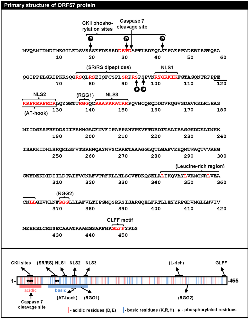 Protein sequence and putative motifs of ORF57. (Top) The amino acid sequence of ORF57 with putative motifs indicated with brackets and the residues making up the motifs shown in red. Phosphorylation sites (P in black circle) are also indicated. (Bottom) A summary of the primary structure of the ORF57 protein (aa 1–455) with the distribution of acidic (red lines, D: aspartic acid, E: glutamic acid) and basic (blue lines, K: lysine, R: arginine, H: histidine) amino acids. The linear motifs identified based on the analysis of the ORF57 aa sequence are shown above and below (CKII-casein kinase II, SR/RS-serine/arginine and arginine/serine dipeptides, NLS-nuclear localization signal, L-rich-leucine-rich domain, GLFF motif-glycine/leucine/phenylalanine/phenylalanine motif, AT hook-adenine-thymine hook, RGG-arginine/glycine/glycine). The functionally unconfirmed putative motifs are in parentheses. The filled circles represent the mapped ORF57 phosphorylation sites.