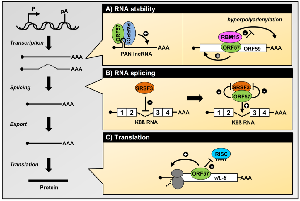 Roles of ORF57 in the posttranscriptional processing of KSHV transcripts. The diagram on the left depicts the major steps of RNA biogenesis, including transcription, RNA splicing, RNA nucleocytoplasmic export, and RNA translation into protein. (A) Enhancement of the stability of KSHV intronless RNAs by ORF57. Cooperative binding of ORF57 with PABPC1 to an ORF57/Mta-responsive element (MRE, hairpin) protects the KSHV PAN lncRNA from degradation in the nucleus [,]. Similarly, ORF57 binding to KSHV ORF59 RNA enhances ORF59 RNA stability by preventing its hyperpolyadenylation by RBM15 protein []; (B) ORF57 promotes K8β RNA splicing by attenuating the suppressive activity of splicing factor SRSF3 (SRp20). ORF57 interacts with SRSF3 and blocks SRSF3 interaction with an intronic region of K8β RNA []; (C) The role of ORF57 in protein translation. ORF57 inhibits miRNA-induced translation inhibition by displacing RISC (RNA-induced silencing complex) from vIL-6 (viral interleukin-6) via competitive binding to the ORF57 MRE, which contains a miR-1293 binding site [].