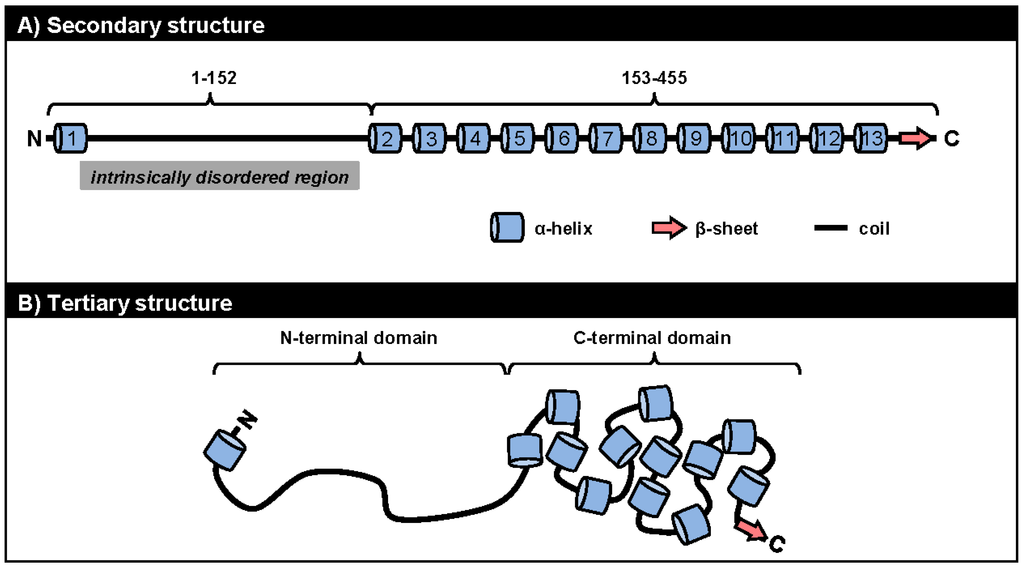 The structural conformation of ORF57 protein. The ORF57 secondary structure (A) predicted by the PSIPRED (Psi-blast based secondary structure prediction) version 3.0 prediction tool (http://bioinf.cs.ucl.ac.uk/psipred/) [] is composed of 13 α-helixes (barrels), one β-sheet (thick arrow), and unstructured coils (thick lines) forming two structurally distinct domains: a unstructured N-terminal domain (aa 1–152) with an intrinsically disordered region (IDR) and an α-helix-rich C-terminal domain (aa 153–455); The proposed ORF57 tertiary structure (B) consists of a flexible linear N-terminal domain and a rigid globular C-terminal domain [].