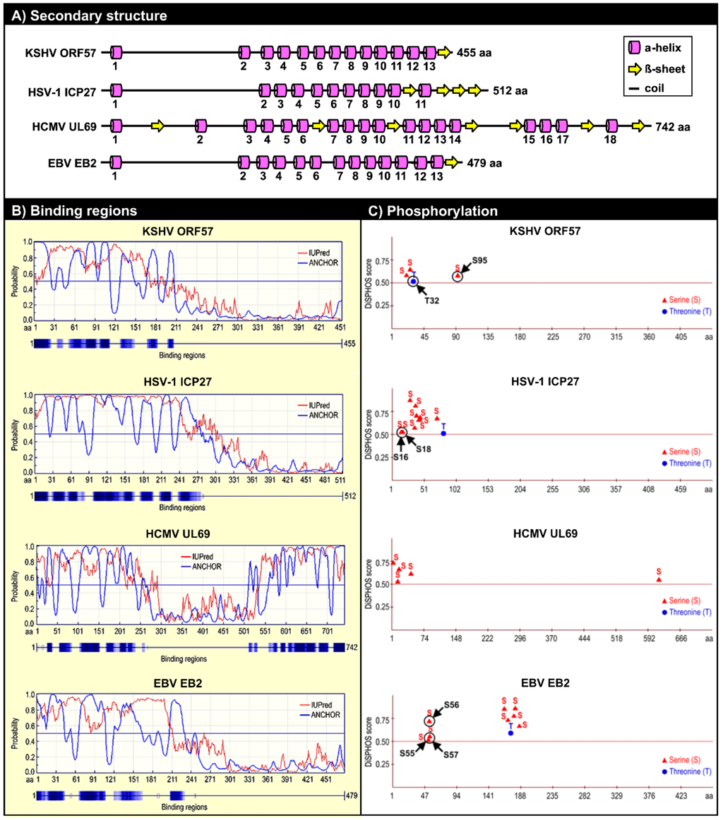 Structural similarities among KSHV ORF57 homologues. (A) Conservation of the secondary structure among KSHV ORF57 homologues: HSV-1 ICP27, HCMV UL69 and EBV EB2 based on PSIPRED version 3.0 prediction tool []. Numbers under each α-helix represent their relative positions from the N- to C-terminus. Numbers at the end of each protein represents the protein length in amino acid residues (aa). The drawings are not to scale. This panel is reproduced with permission from []; (B) Prediction of the disordered binding regions of KSHV ORF57, HSV-1 ICP27, HCMV UL69, and EBV EB2 both by IUPred (http://iupred.enzim.hu/) and by ANCHOR software (http://anchor.enzim.hu/) []; (C) Phosphorylation sites predicted from KSHV ORF57, HSV-1 ICP27, HCMV UL69, and EBV EB2 proteins by DISPHOS 1.3 software for viruses group predictor, with a threshold value above 0.5 (http://www.dabi.temple.edu/disphos/) []. Arrows indicate the experimentally confirmed phosphorylation sites [,,]. S, serine; T, threonine.