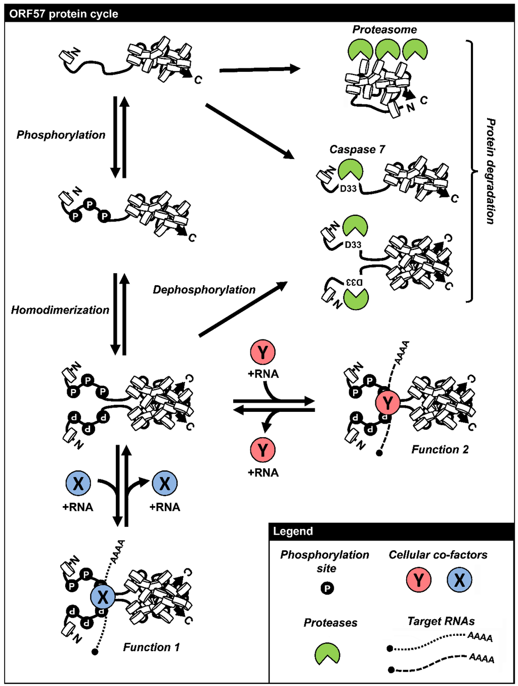 The life cycle of ORF57 protein. KSHV ORF57 features an intrinstically disordered N-terminal domain and a highly structured C-terminal domain. This protein is translated initially as a monomeric protein and undergoes the protein N-terminal phosphorylation by host CKII or other kinases. The monomeric form of ORF57 subjects to cleavage by caspase 7 or degradation via proteasomal pathway. Two phosphorylated monomeric ORF57 polypeptides dimerize through the C-terminal α-helixes 7–9, resulting in the formation of an ORF57 homodimer. ORF57 homodimers interact with cellular protein-RNA complexes to exert various functions of ORF57 and otherwise may subject to caspase 7 digestion. This figure is reproduced with permission from [].