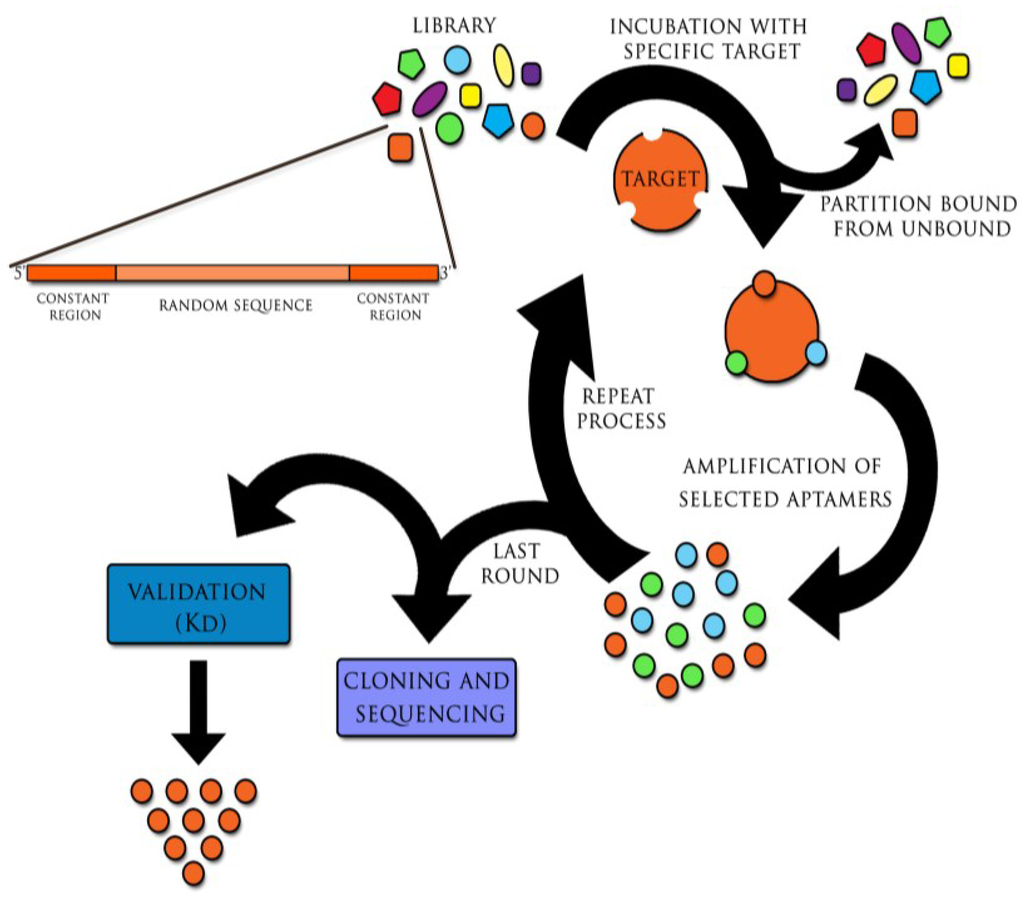 The SELEX (Systematic Evolution of Ligands by Exponential Enrichment) process. The initial library of DNA or RNA sequences is incubated with the target molecule. Sequences with the highest specificity and affinity bound to the target, while others are removed from the primary sequences pool. Selected molecules are recovered. Then, if initially DNA molecules were used, they are amplified through polymerase chain reaction (PCR); RNA sequences are reverse transcribed in vitro into cDNA and then, similarly as DNA molecules, used in PCR reaction. Amplified oligonucleotides are put through additional selection cycles. Usually 12–15 selection/replication cycles are required to obtain highly specific aptamers. Received aptamers are isolated, cloned and sequenced with following validation so as to find the most specific target aptamer with the highest binding affinity. (Kd, dissociation constant).