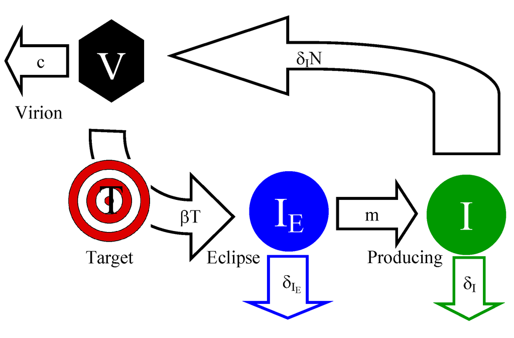 In this “extended” standard mathematical model we allow for two types of virus-infected cells: cells in the eclipse phase which are not making the virus, IE, and cells that are actively producing the virus, I (Figure 1). Cells in the eclipse phase transition to the state of virus production at a rate, m, and both types of cells die at rates