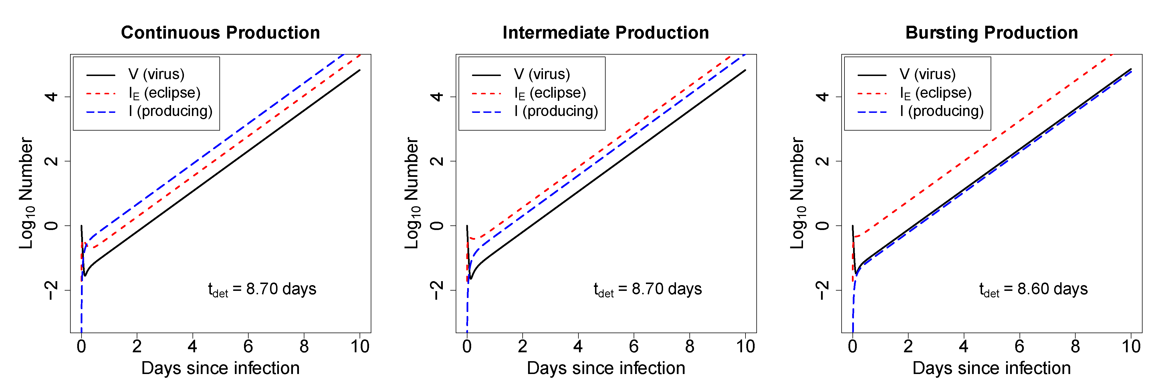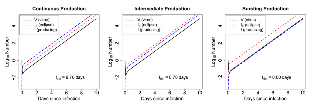 For biologically reasonable parameter values, the mode of virus production by infected cells has little impact on the time to virus detection in deterministic simulations. We solve the mathematical model (Equations (1)–(3)) numerically and plot predicted values for the infectious virus (V), infected cells in the eclipse phase (IE), and virus-producing cells (I). Time courses are shown for the model with continuous-mode virus production (short eclipse phase, left panel), intermediate mode virus production (eclipse phase takes approximately half of the life-span of infected cells, middle panel), and bursting mode of virus production (long eclipse phase, right panel). Parameters used are given in Table 1. All infections are started with V0 = 1. The time of virus detection, tdet, is the time when the virus population reaches Vdet = 104 infectious viruses and is indicated on individual panels.