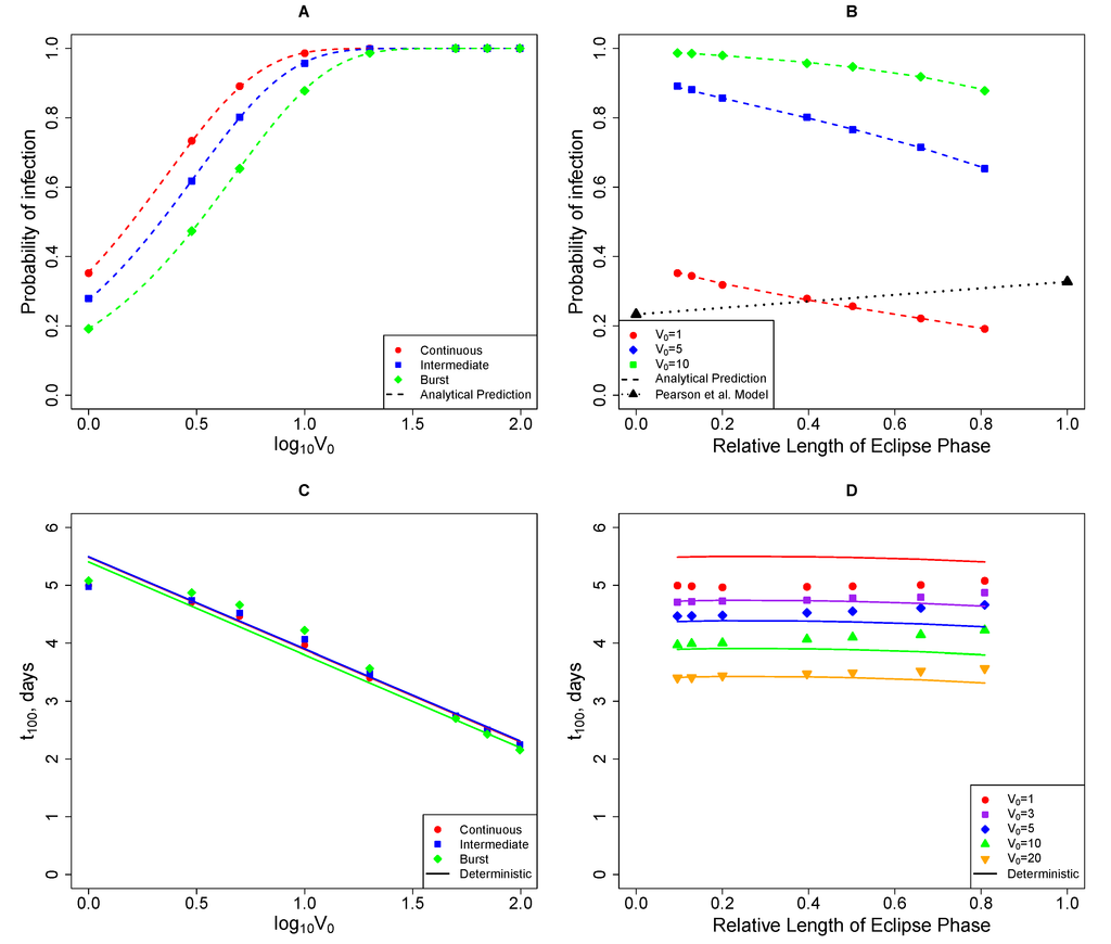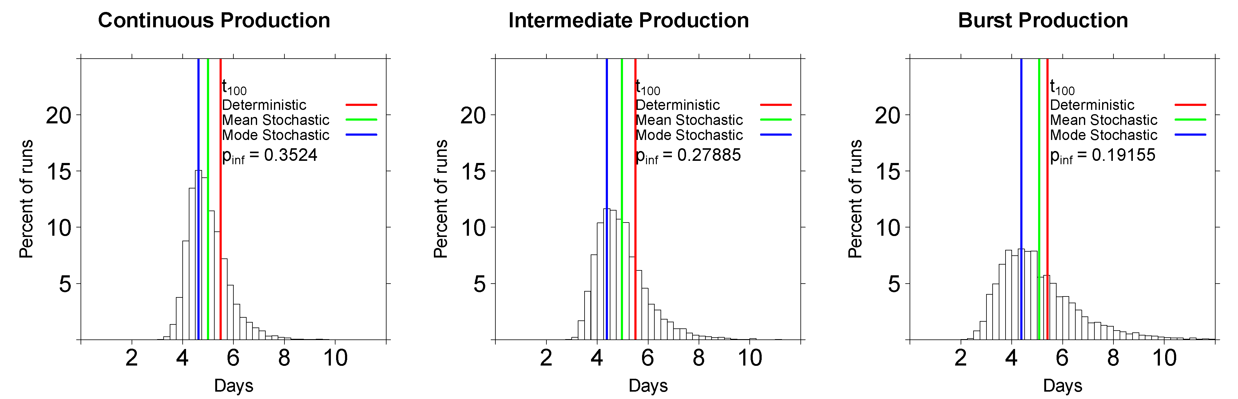 First, stochastic simulations predicted shorter average times to 100 viruses than the deterministic simulations, independently of the mode of virus production (Figure 3); the difference could reach 1 day for a particular set of parameters (Figure 4D). Second, the mode of virus production had little influence on the time to 100 viruses (Figure 3 and Figure 4), in contrast with a previous model [22]. Third, the mode of virus production influenced the variability in the times to 100 viruses, with a burst-like virus production resulting in more variable times to detection, consistent with previous observations [22]. The higher heterogeneity in t100 between different runs in the model with bursting virus production is expected, since some cells do not survive to make viruses. Lastly, and somewhat unexpectedly given previous results [22], a burst-like mode of virus production led to a lower probability of established infection, compared to a continuous/budding production mode (0.19 vs. 0.35, when starting with a single infectious virion for the parameters in Table 1, see also Figure 3 and Figure 4). This stems from the assumption that cells in the eclipse phase have a non-zero chance of dying, and thus, an increase in the duration of the eclipse phase reduces the chance that the cell will transition into a state of virus production.