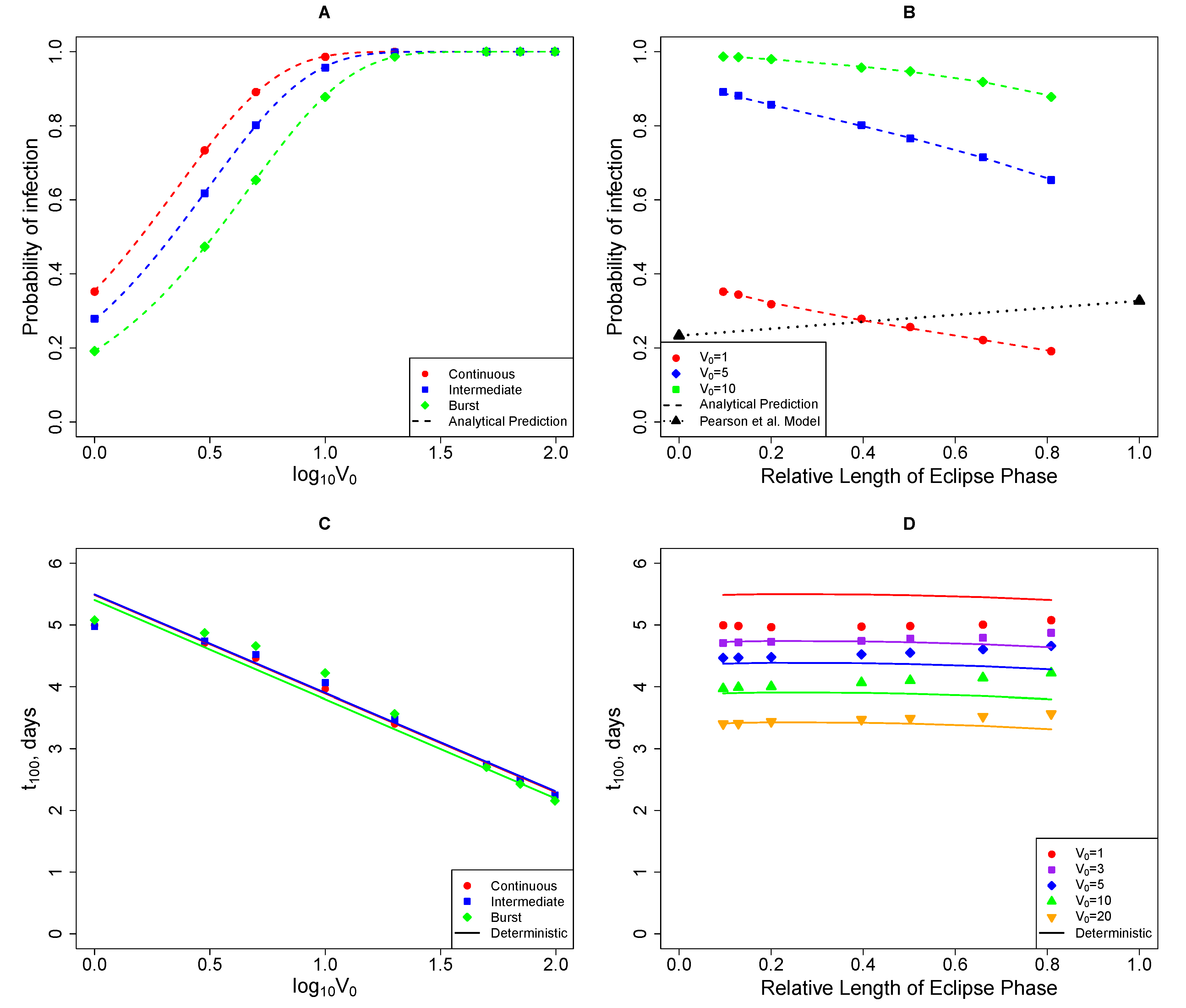 Changes in the probability of established infection (pinf, panels A and C) and the time to 100 infectious viruses (t100, panels C and D) with the initial number of viruses (V0) and the relative duration of the eclipse phase (Tm, Equation (4)) as predicted by stochastic and deterministic simulations of the mathematical model (Equations (1)–(3)). In panels A and B, points represent values from stochastic simulations and dashed lines are analytical predictions (Equations (13)). Black triangles in panel B show the probability of infection for budding and bursting modes of virus production by infected cells as calculated in Pearson et al. [22]. In panels C and D, points are the results from the simulations and solid lines are the predictions from deterministic solutions of the model. Parameters for the simulations are given in Table 1 with values for the maturation rate m varied between 0.7 day−1 and 5 day−1 with δI being adjusted to satisfy constrains as described in the text.