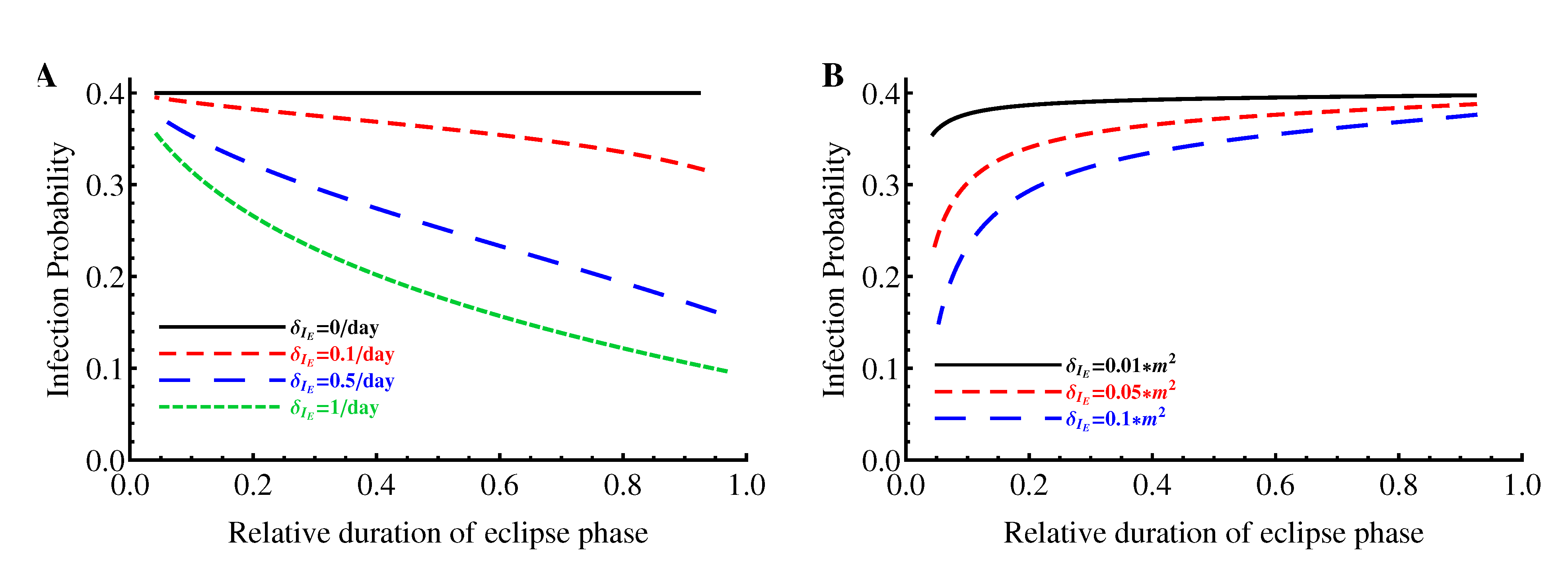 We reasoned that the result that the probability of established infection decreases as the duration of the eclipse phase increases (or as the mode of virus production switches from budding to bursting) may depend on the particular set of parameters used in the simulations. Since we have an analytical expression for the probability of infection, pinf, and for the relative duration of the eclipse phase, Tm, we explored whether our predictions from simulations hold true for a wider range of parameters. We observed that the results were dependent on how changes in a relative duration of the eclipse phase were achieved. When only the transition rate, m, or only the death rate of cells in the eclipse phase, δIE, was changed, the probability of established infection always decreases with a longer duration of the eclipse phase as long as δIE > 0 (Figure 5A). However, if m and δIE were correlated, the opposite trend may be observed (i.e., increasing the duration of the eclipse phase increases the probability of established infection if it also increases the death rate in the eclipse phase; Figure 5B). Thus, we conclude that whether the mode of virus production leads to either a higher or lower probability of established infection in general depends on the parameters of the model; however, if the parameters are uncorrelated, the bursting mode of virus production leads to a lower probability than the continuous/budding production mode as long as δIE > 0. If δIE = 0, then the mode of virus production has no influence on the probability that an infection becomes established. The latter result is in contrast with the conclusion found in simulations with the standard model [22].