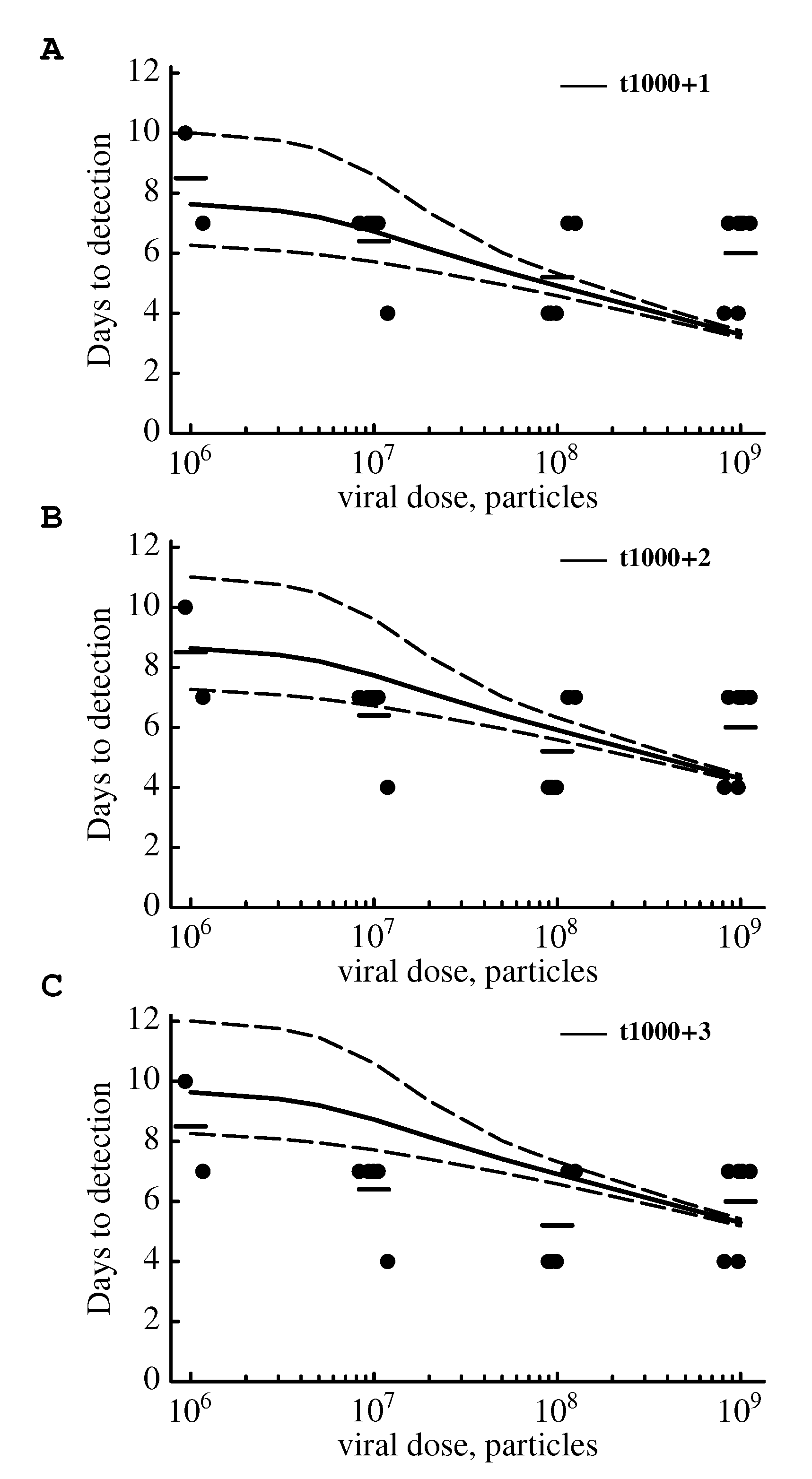 Stochastic simulations of the mathematical model do not accurately predict the change in the time to virus detection with increasing viral dose. In experiments, monkeys were challenged intrarectally with different doses of SIVmac251 and the time for virus detection in the blood was recorded [16]. We plot the time to virus detection for individual animals per dose (dots), the average of these times (bars), and the predictions from stochastic simulations of the mathematical model (solid lines) along with the 95% confidence intervals of the model predictions (dashed lines). In these simulations, we assume that exposure to 106 particles leads to an infection with one infectious virus (V0 = 1), since in these experiments only a single founder virus was detected [16]. Simulations were run with parameters for an intermediate mode of virus production (Table 1). Simulations were run stochastically until 1000 infectious viruses were generated (t1000) and then deterministically for 1 (panel A), 2 (panel B), or 3 (panel C) additional days. Given the growth rate of the virus population, ro, (Table 1) the virus population will expand approximately 4, 18, or 76 fold in 1, 2, or 3 days, respectively.