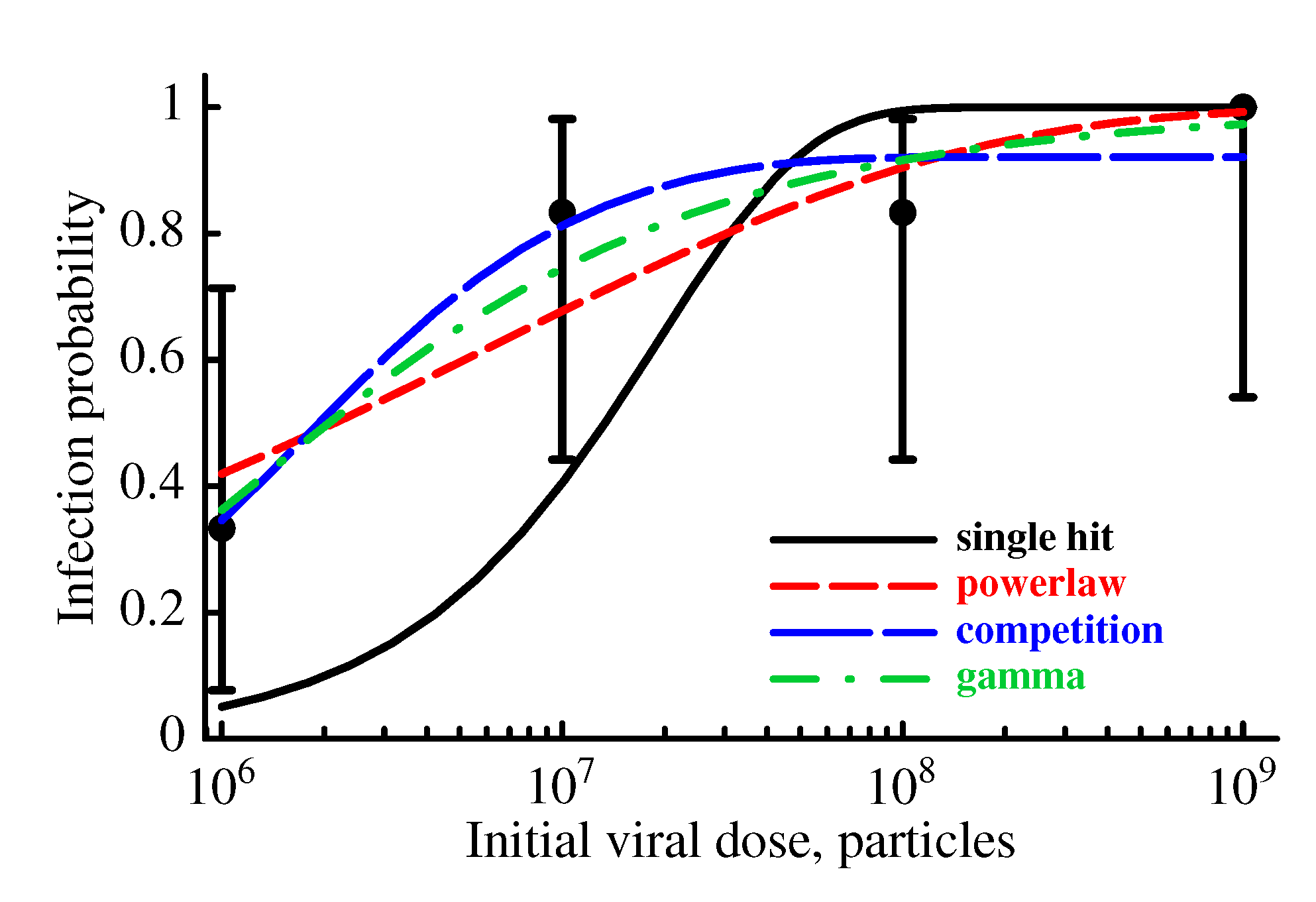 We considered several extensions of this simple “single-hit” model. The first alternative model which we call a “power-law” model assumes that the change in the probability of infection with increasing viral dose is given by the relationship