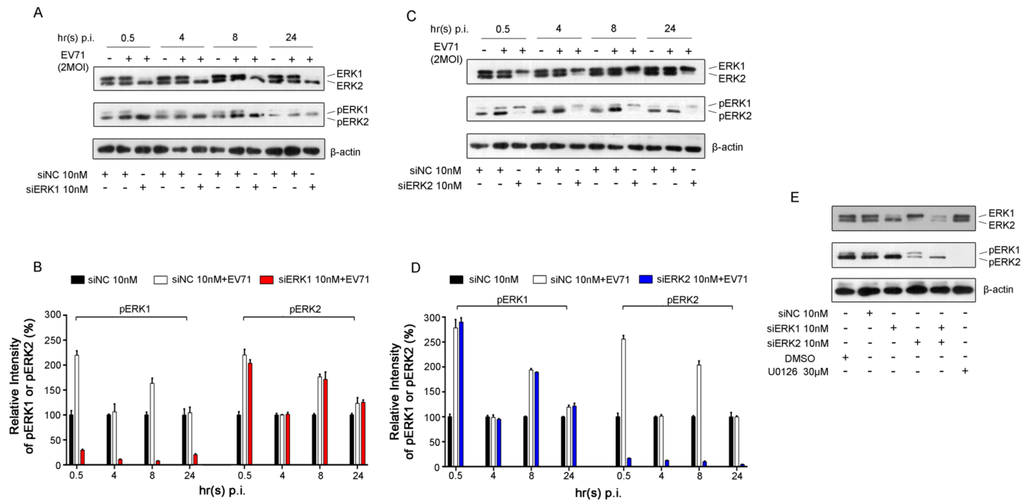 Biphasic activation of ERK1/2 caused by EV71 infection, including early transient and late sustained phases, has been demonstrated in our previous study []. To further identify the activation status of specific ERK isoform (ERK1 or ERK2) in viral infection, the phosph-ERK1 (pERK1) and phosph-ERK2 (pERK2) under EV71 infection were determined separately. As shown in Figure 1A and Figure 1B, a biphasic activation of ERK2 induced by EV71 was observed in RD cells pre-treated with ERK1 siRNA (designated as siERK1) compared with that of respective uninfected groups pre-transfected with negative control siRNA (designated as siNC).