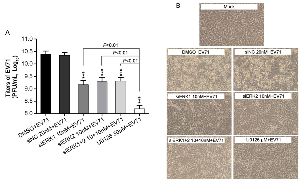 It has been demonstrated that MEK1 and MEK2 play a different role in EV71 replication []. To further elucidate the roles of downstream kinases of MEKs, ERK1 and ERK2 in EV71 replication, the effects of distinct knockdown of ERK1 or ERK2, or both on progeny viral titers were investigated. A clear reduction of progeny EV71 titers by about 90% were obtained in cells pre-treated with siERK1, siERK2 and siERK1+2, respectively, when compared with that of siNC control (Figure 2A).