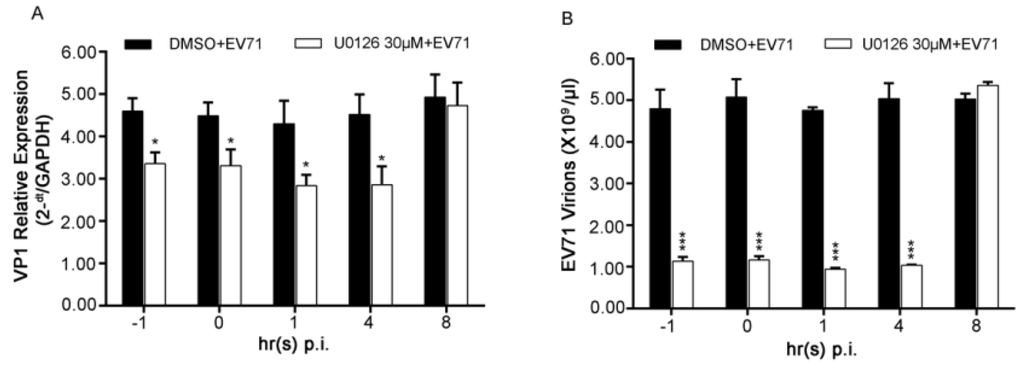 In addition, according to the time-of-drug addition assay (Figure 5), it appeared that virus successful biosynthesis process was more closely related to the late phase of ERK1/2 activation induced by EV71 than the early one. This result was consistent with and further confirmed previous studies in which the early phase of ERK1/2 activation is not involved in viral propagation directly whereas might be the consequence of the virus-receptor binding [,].