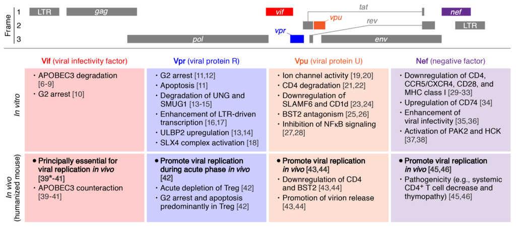 Human immunodeficiency virus type 1 (HIV-1), a virus belonging to the genus Retroviridae, was identified in 1983 as the causative agent of acquired immunodeficiency syndrome (AIDS) [1,2]. HIV-1 genome consists of nine genes (Figure 1, top), and five out of the nine genes, gag, pol, env, tat, and rev, are essential for viral replication [3]. On the other hand, the remaining four genes, vif, vpu, vpr, and nef, are not always required for viral replication in in vitro studies using cell culture system [3,4]. Recent investigations have shed light on the roles of these viral accessory proteins in counteracting, modulating, and evading various host restriction factors responsible for anti-HIV-1 cellular intrinsic immunity [4,5].