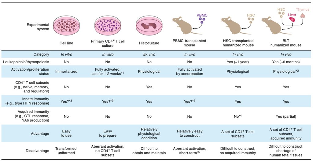 Experimental system for HIV-1 infection. The detailed explanation of each experimental system is described in the text. *1, to perform HIV-1 replication assays, primary CD4+ T cells should be artificially activated by mitogens (e.g., phytohemaggluttinin and anti-CD3/CD28 antibodies); *2, because human thymocytes are efficiently educated in human thymic transplant (i.e., human MHC), the human T cells differentiated in BLT humanized mice may recognize the tissues of recipient mouse as foreign antigen, which can lead to the onset of graft-versus-host reaction; *3, these systems are capable of responding type I interferon stimulation, which can lead to the expression of interferon-stimulating genes. However, these systems are incapable of triggering innate immune sensing because of the absence of dendritic cells and macrophages; *4, because human thymocytes are educated in the thymus of recipient mouse (i.e., murine MHC), the human T cells differentiated in HSC-transplanted humanized mice are unable to efficiently receive the antigen stimulation from human antigen presenting cells; *5, the transplanted human PBMCs recognize the tissues of recipient mouse as foreign antigen and cause graft-versus-host reaction, which results in the aberrant xenoactivation. BLT, bone marrow/liver/thymus; CTL, cytotoxic T lymphocyte; HSC, hematopoietic stem cell; IFN, interferon; NAb, neutralizing antibody; PBMC, peripheral blood mononuclear cell.