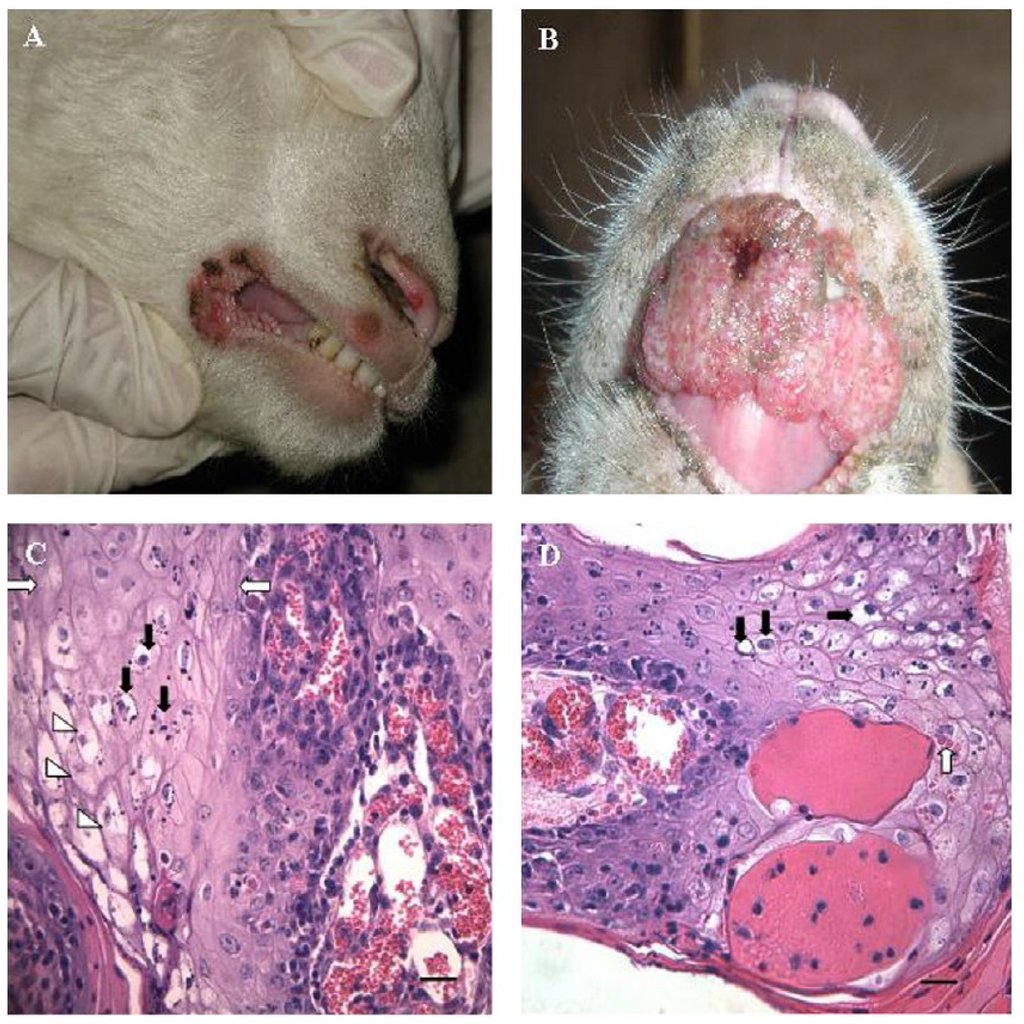 (A) Sheep showing multiple nodular lesions on the upper and lower labia and the junction of lips; (B) Sheep with severe proliferative orf lesions in the skin of lips and muzzle; (C) Spinous cells of the stratum spinosum showing acanthosis (white arrows), vacuolation (arrow heads) and karyorrhexis (black arrows). (H&E, 400×; bar = 100 µm); (D) Intraepithelial ballooning degeneration (black arrows) and intracytoplasmic eosinophilic inclusion bodies (white arrows) in the acanthocytes. (H&E, 400×; bar = 100 µm) (adapted from Zhao et al. [] with permission from Elsevier publishing).