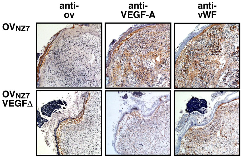 Orf virus (ORFV) vascular endothelial growth factor (VEGF) promotes blood vessel growth in ORFV infected sheep. Scarified skin was inoculated with wt ORFVNZ7 or ORFV-VEGF∆. Shown is immunohistological stained tissue from lesions of wt infected and VEGF∆ infected animals at 6 days post-infection (magnification × 50). The sections were stained with peroxidase conjugated anti-ORFV F1L (major coat envelope protein) antibody (anti-OV), anti-VEGF-A antibody (anti-VEGF-A) and anti-von Willebrand factor antibody (anti-vWF) that stains the endothelial cells of blood vessels. The figure was reproduced from Figure 4 in [] with permission from Elsevier publishing.