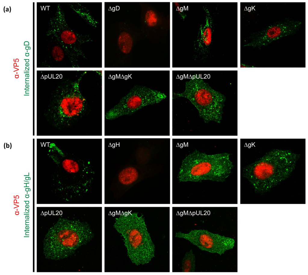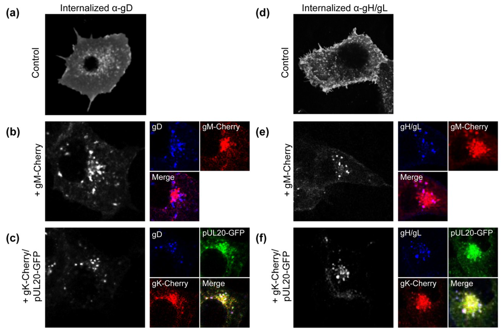 In conclusion, our work demonstrates important but differing roles for both HSV-1 gM and the gK/pUL20 complex in mediating the internalization of the viral envelope proteins gD and gH/gL from the plasma membrane, and the targeting of gD and gH/gL to intracellular compartments for incorporation into assembling virions.