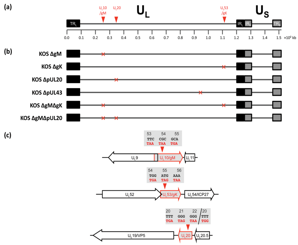 Schematic representation of recombinant viruses constructed. (a) Representation of the prototypic arrangement of the HSV-1 genome with the unique long (UL) and unique short (US) regions flanked by the terminal repeat (TR) and internal repeat (IR) regions; (b) Relative genomic positions of genes mutated to create recombinant viruses; (c) Schematic representation of mutations created. Viruses lacking gM, gK, and pUL20 were constructed by replacing codons 53–55, 54–56, and 20–22 with three stop codons in the UL10, UL53, and UL20 genes, respectively.