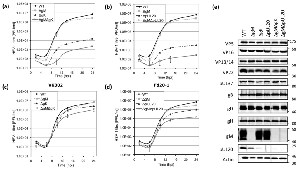 To investigate the effect of deleting gM, gK, and pUL20 on virus replication rates, single-step growth curves were performed in Vero cells and the gK- and pUL20-complementing cell lines (VK302 and Fd20-1). In Vero cells, the deletion of gM from the virus resulted in peak titers similar to WT, with a c.a. 2-fold reduction at 24 h post infection (hpi) (Figure 3a). The replication of ΔgK and ΔpUL20 however were severely attenuated, showing approximately 450- and 2000-fold reduction in final titers compared to WT respectively (Figure 3a,b). Furthermore, the deletion of gM with gK or pUL20 resulted in a synergistic defect on replication with a reduction of 3000- and 25,000-fold in final titers respectively compared to WT respectively (Figure 3a,b). The complementing cell lines were able to correct the attenuated phenotypes (Figure 3c,d). However the replication of the deletion viruses was not rescued to WT levels indicating that the complementation provided by the cell lines is not complete, although we cannot formally rule out the possibility that random additional changes may have occurred during the construction of the recombinant viruses that are not fully rescued by these complementing cell lines. In the VK302 and Fd20-1 cell lines, the deletion of gM results in similar final titers compared to WT (Figure 3c,d). These results show that whilst the deletion of gM from the virus has little effect on replication, the deletion of gK or pUL20 results in a highly attenuated virus, as expected from previous publications [7,36,37]. Furthermore, the deletion of gM in combination with gK or pUL20 gives rise to a synergistic defect in HSV-1 replication. The severe attenuation in single-step growth curves observed with both gK- and pUL20-deficient viruses in non-complementing cell lines could be the result of reduced numbers of virions being produced, the production of non-infectious virions, or a combination of the two.