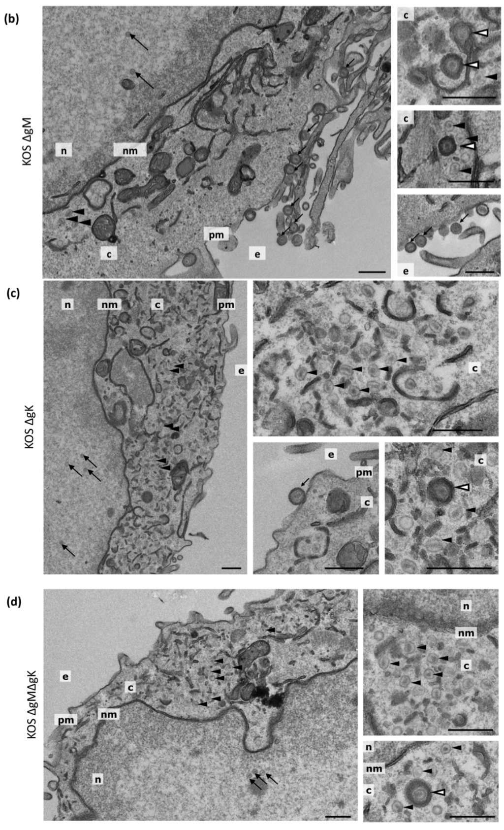 - Jayachandra, S.; Baghian, A.; Kousoulas, K.G. Herpes simplex virus type 1 glycoprotein K is not essential for infectious virus production in actively replicating cells but is required for efficient envelopment and translocation of infectious virions from the cytoplasm to the extracellular space. J. Virol. 1997, 71, 5012–5024. [Google Scholar] [PubMed]