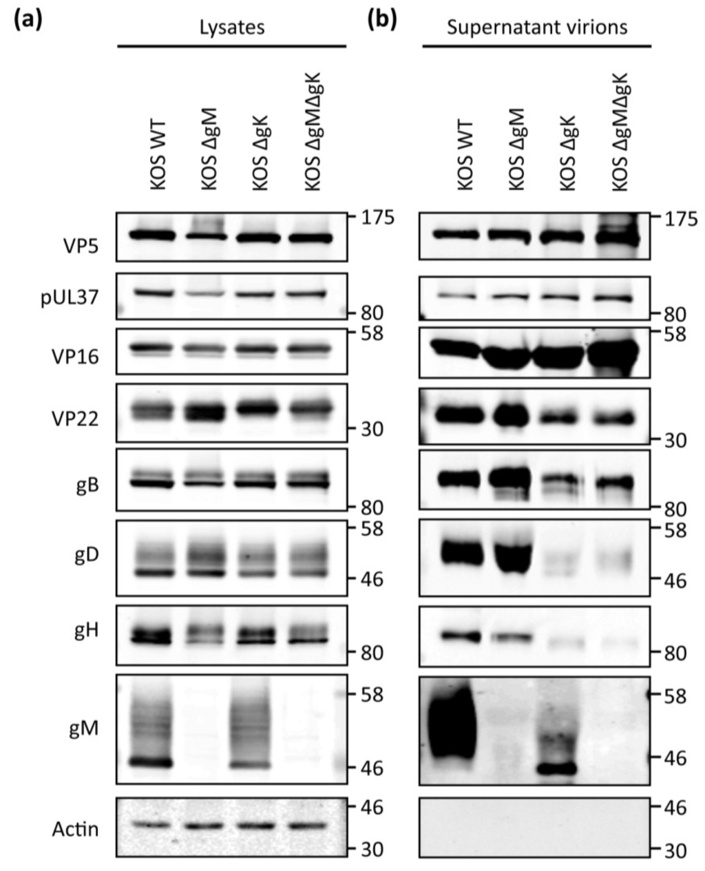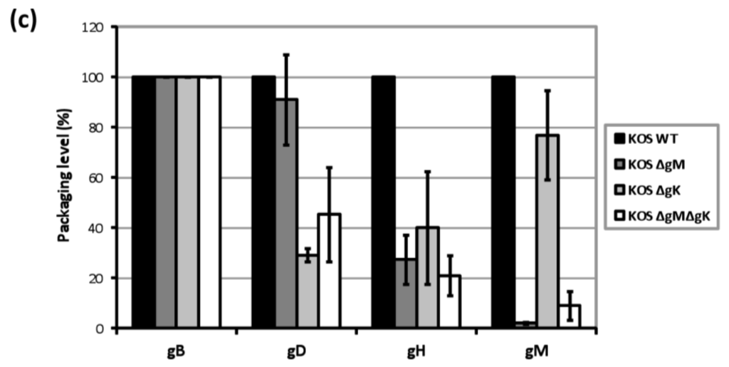 Viral protein incorporation in WT, ΔgM, ΔgK and ΔgMΔgK virions. HaCaT cells were infected at 5 PFU/cell and after 24 hpi, (a) cell lysates were prepared and (b) progeny viral particles were isolated from clarified cell culture media by centrifugation through a 33% sucrose cushion. Cell lysates and supernatant-derived virions were separated by SDS-PAGE and analysed using the indicated antibodies. Molecular mass markers (in kDa) are indicated on the right; (c) Using densitometry, packaging levels were calculated by dividing the amount of protein detected in supernatant-derived virions (normalized for gB) by the amount of protein in supernatant-derived virions of WT virus (normalized for gB). Error bars represent standard error of three independent experiments.