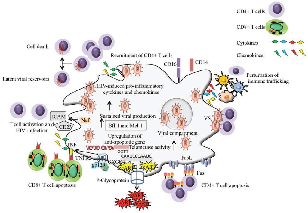 Macrophages fuel HIV-1 pathogenesis. HIV-1 infected macrophages secrete pro-inflammatory cytokines and chemokines that attract T cells in their vicinity, thereby transmitting virus to uninfected CD4+ T cells. Infected CD4+ T cells die soon (due to viral cytopathic effects or antiviral immune response) or return into memory CD4+ T cells as latent viral reservoirs. HIV-1 infected macrophages secrete soluble CD23 and ICAM that results in CD4+ T cell activation favoring the viral infection to CD4+ T cells. Viral gp120 increases the expression of TNF-α and TNFR2 in macrophages and T cells, resulting in CD8+ T cell apoptosis. Bystander CD4+ T cell apoptosis is triggered by FasL ligation to Fas receptor. HIV-1 infection of macrophages enhances its telomerase activity. HIV-1 expands macrophage survival by upregulating antiapoptotic genes. The P-glycoprotein transporter present on macrophages pumps out the antiretroviral drugs and limits the distribution of antiretroviral drugs to macrophages. Furthermore, macrophages spread the virus to CD4+ T cells through virological synapses. HIV-1 infected macrophages store virus into the intracellular cytoplasmic compartments providing the protection against antiviral immune response. HIV-1 infection of macrophages results in the secretion of pro-inflammatory cytokines and chemokines that ultimately accounts for the perturbation of immune trafficking.