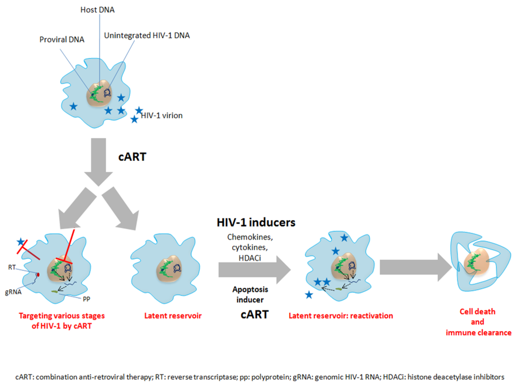 Therapeutic approaches could favor the clearance of HIV-1 from macrophage reservoirs. Macrophages harbor integrated as well as unintegrated proviral DNA. Antiretroviral therapy interferes with several steps of HIV-1 life cycle including entry, reverse transcription, proviral DNA integration, polyprotein processing and release of viral progeny. HIV-1 infection also results in the establishment of latency in less studied reservoirs (macrophages). Macrophages harboring latent HIV-1 [157,158] can be activated by variety of approaches including chemokines, cytokines and HDACi. In addition several apoptotic reagents have been also employed which can specifically induce apoptosis in infected macrophages in vitro [44].