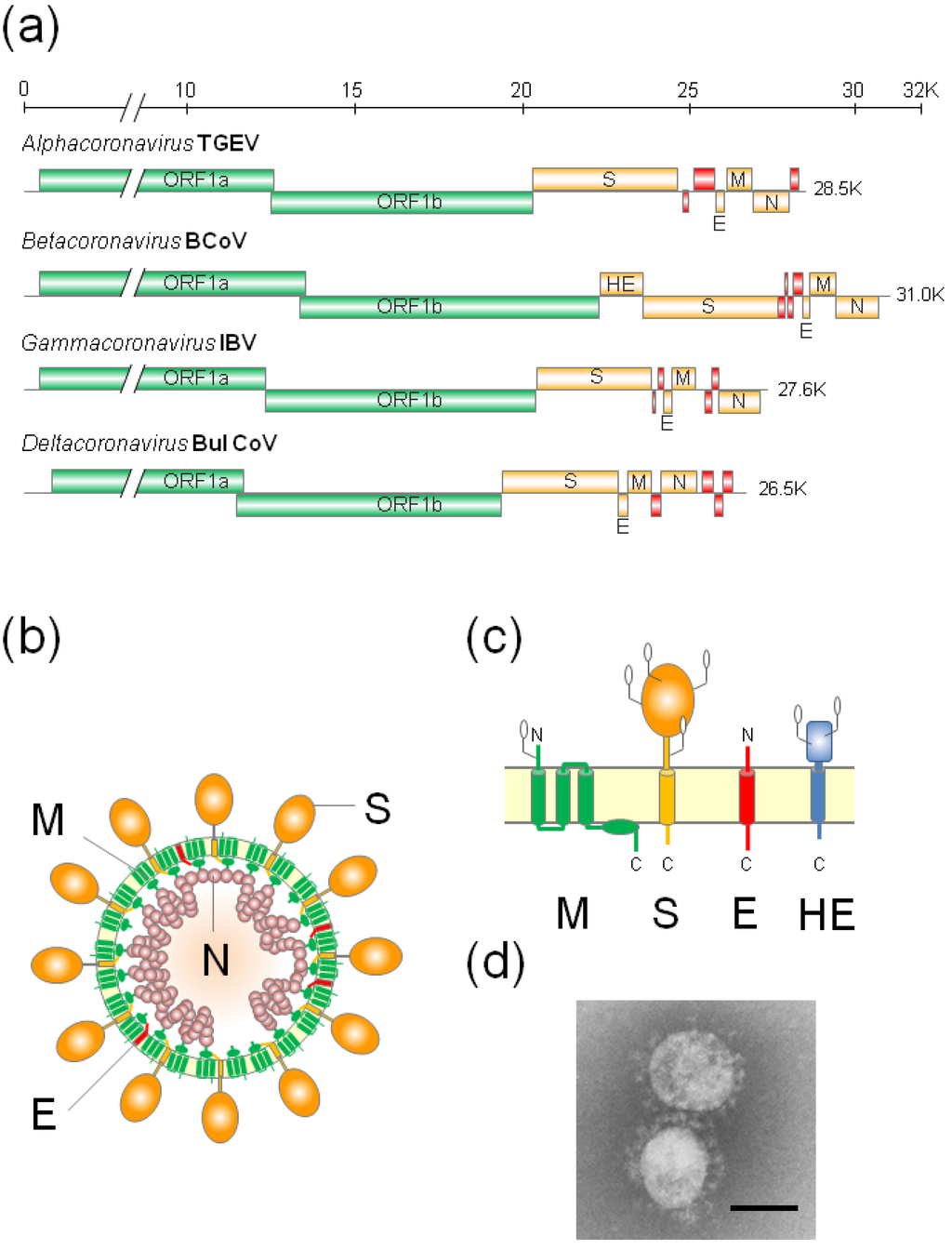 (a) Genome organizations of various Coronavirus genera. The first two-thirds of the genome contains open reading frame (ORF)1a and ORF1b, which encode the replicase/transcriptase proteins (Green). The remaining one-third of the genome encodes four structural proteins: spike (S), envelope (E), membrane (M), and nucleocapsid (N) proteins (Orange). Some betaoronaviruses have an additional hemagglutinin-esterase (HE) gene (Orange). The genome of each genus or species has a set of unique accessory proteins (red); (b) Schematic diagrams of coronavirus virions; (c) The topology of the four structural envelope proteins. All proteins are depicted as monomers, but the S and HE proteins form homotrimers and homodimers, respectively. Oligosaccharides are shown on the M, S, and HE proteins. Although a number are omitted, the S and HE proteins contain 21 to 35 and 9 (BCoV HE) potential N-glycosylation sites, respectively; (d) Electron micrograph of SCoV. Bar: 100 nm. (EM image courtesy of Dr. Nagata at National Institute of Infectious Diseases).