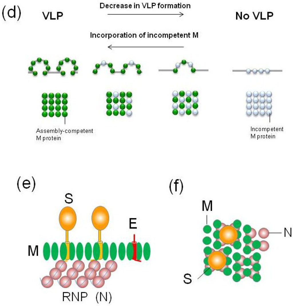 These studies indicate that M protein incorporation into virions or VLPs is required for the presence of E (or N) proteins and, moreover, for homotypic M-M interactions though multiple contact sites of its overall domains. Based on these biochemical studies, one hypothesis is that M proteins would form a lattice-like dense matrix due to lateral M-M interactions within the viral envelope [45,46], which is partially observed in morphological studies [100,101]. This lattice-like matrix is proposed to play many roles in virion assembly: (i) provide an assembly scaffold along with the E or N proteins; (ii) package RNPs into virions by interacting with N proteins; (iii) exclude foreign proteins by occupying the space and not interacting with them; and (iv) incorporate S (or HE proteins) into the vacancies of the lattice via specific interactions with M proteins, resulting in regular positioning of these proteins in the lattice (Figure 3e,f). Because of the significantly different space filling between S homotrimers and HE homodimers, there might be two types of vacancies for each protein [45,46].