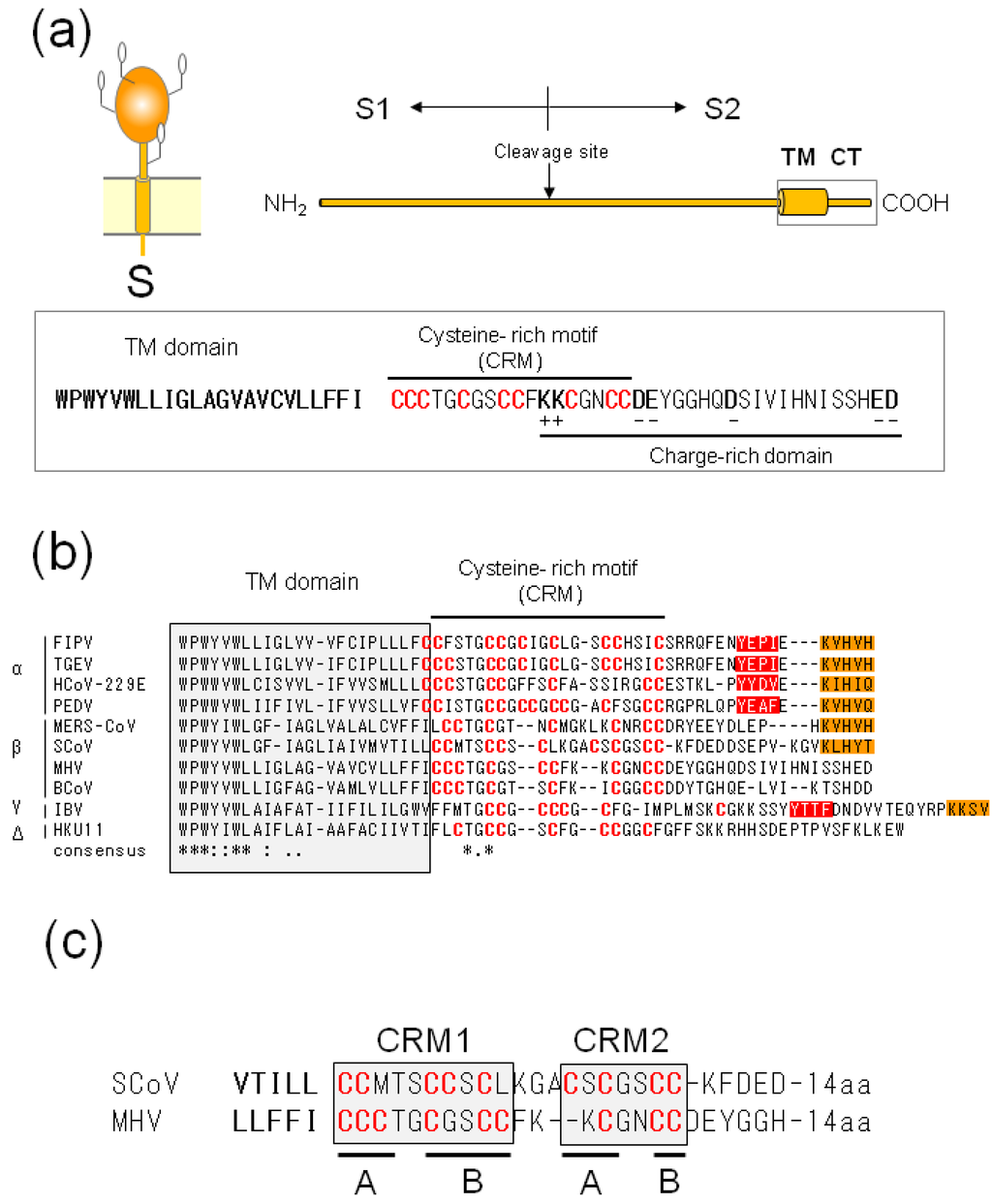 (a) Schematic diagram of CoV-S proteins and CT domain amino acid sequences. The CoV S2 domain can be further divided into three subdomains; a large ectodomain, a single TM domain, and a CT domain (top). The deduced CT domain sequence of MHV-S (A59) protein comprises two subdomains: a cysteine-rich motif (CRM) and charge-rich domains, which partially overlap (bottom); (b) C-terminal ends of 10 CoV-S proteins. Amino acid sequence alignment was performed by CLUSTALW. Shaded box indicates the deduced TM domain. Cysteine residues in CRM are shown in red. Orange and red boxes indicate potential ER retrieval signals (KxHxx- or KKxx-motif) and tyrosine-dependent localization signals/internalization signals (YxxФ motif, where Ф can be F, I, L, M or V), respectively. (c) Comparison of the CRM domains of SCoV- and MHV-S. The CRM can be further divided into four subclusters.