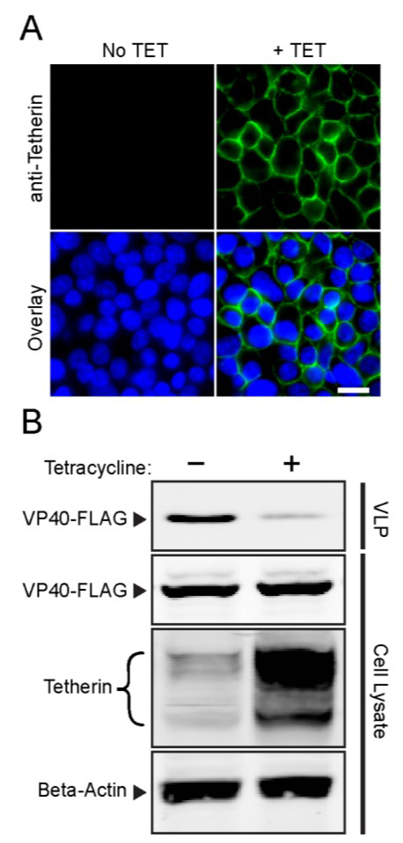 Validation of Tet-On AU1-tetherin cells. (A) Induction of tetherin expression. Tet-On AU1-tetherin cells were incubated in the presence or absence of tetracycline (TET) for 16 h. Cell surface tetherin was detected by immunostaining of fixed, non-permeabilized cells with a tetherin-specific pAb (green) and nuclei were counterstained using Hoechst (blue). Epifluorescence microscopy images are representative of three independent experiments. Bar = 20 µm; (B) Ebola VLP release assay. Tet-On AU1-tetherin cells were incubated with or without tetracycline for 16 h and then transfected with an Ebola VP40-FLAG-expressing plasmid. At 48 h post-transfection, VLP were pelleted and cells were lysed, and proteins detected by SDS-PAGE and WB using anti-FLAG mAb, anti-tetherin pAb, and anti-Beta-actin mAb (loading control).