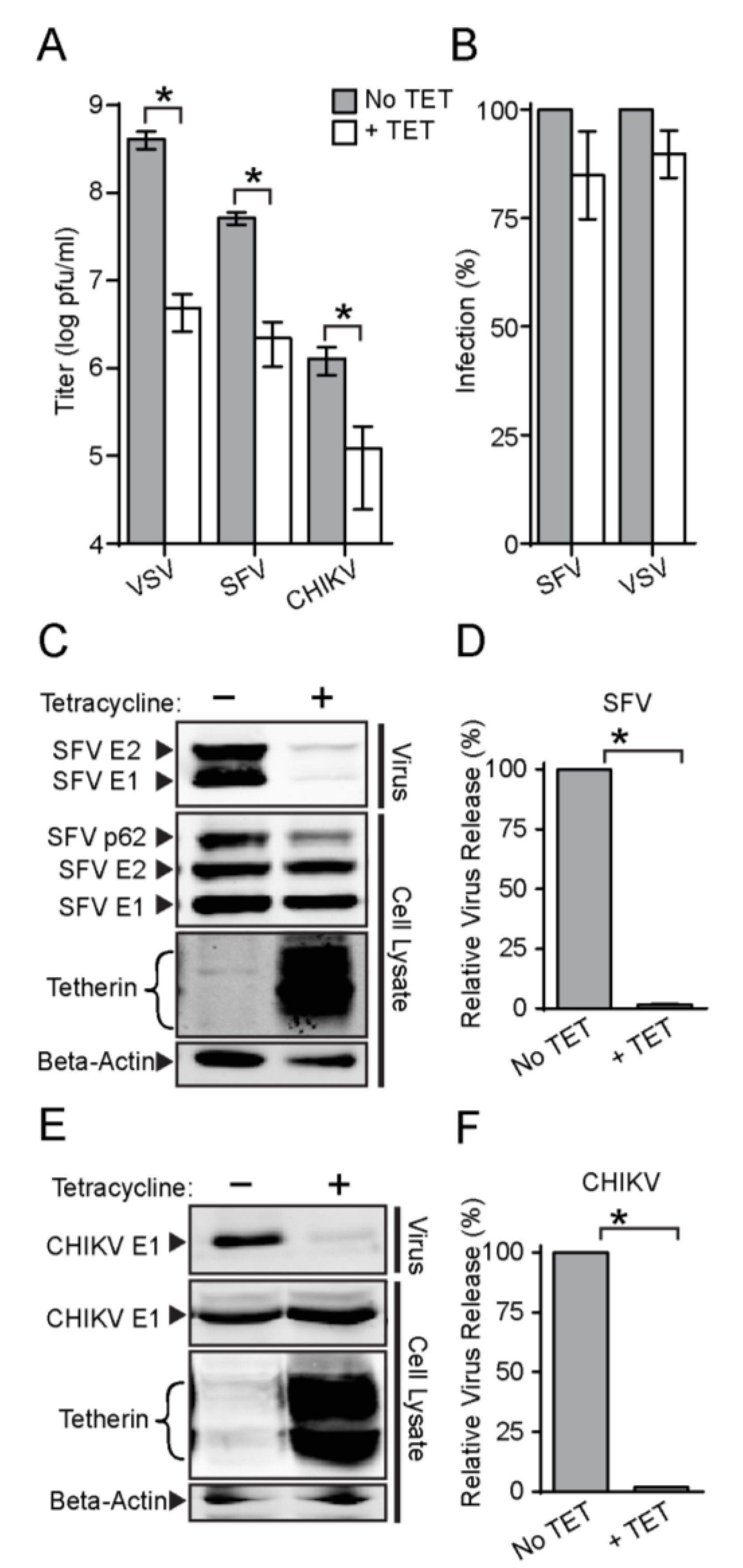 Tetherin expression inhibits the release of infectious SFV and CHIKV. (A) Tet-On AU1-tetherin cells were incubated with or without tetracycline for 16 h and then infected with VSV, SFV, or CHIKV at a MOI of 10 for 7 h (VSV and SFV) or 10.5 h (CHIKV) to assess single cycle virus infection. Infectious progeny virus was titered and graphed in a log plot. The symbol * is used throughout to indicate a statistical significance of p<0.05; (B) Primary virus infection assays. Tet-On AU1-tetherin cells were incubated with or without tetracycline for 16 h and infected with SFV (MOI = 2) or VSV (MOI = 0.04), multiplicities that allowed quantitation of primary infection. Cells were cultured overnight in medium containing 20 mM NH4Cl, and primary virus infection was quantitated and normalized to that of untreated cells. Graphs represent the mean and SD of three independent experiments. (Panels C–F). Virus particle release was determined by infecting cells with SFV (C, D) or CHIKV (E, F) as described in panel A. The secreted virus was pelleted and the cells were lysed, and the indicated viral and cell proteins were quantitated by SDS-PAGE and WB as in Figure 1B. The efficiency of virus particle release is shown in panels D and F, where the graphs represent the mean and standard deviation (SD) of three independent experiments. Note in the WB the SFV pAb detects p62, E2 and E1, while the CHIKV mAb detects E1.