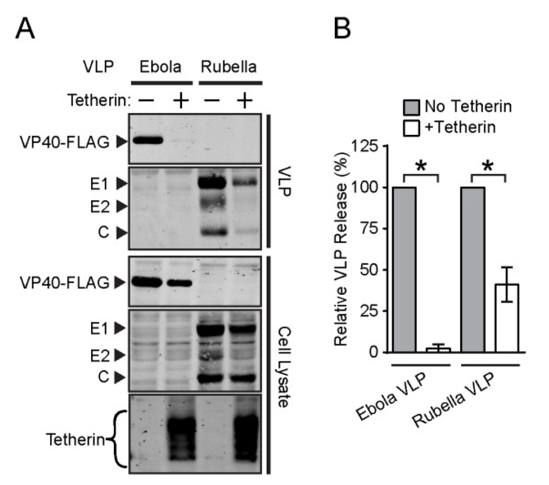 For virus-like particle (VLP) release assays, constructs engineered to express the Ebola virus VP40 or DENV prM-E proteins were transfected into Tet-On AU1-tetherin cells using Lipofectamine 2000 and following the manufacturer’s protocol. Tetracycline was added 5 h post-transfection to induce tetherin expression. For the RuV VLP release assay, a different approach was utilized since the plasmid expressing RuV Capsid-E2-E1 (pcDNA.4/TO RuV-24S) was regulated by tetracycline. HEK293T cells were transfected with an AU1-tetherin-expressing construct (pCB6-AU1-BST2M2, not inducible by tetracycline) or a control plasmid along with the plasmids expressing the RuV structural proteins or Ebola VP40. At 5 h post-transfection, tetracycline was added to induce expression of the RuV proteins. Cell lysates and VLP secreted into the culture media were harvested at 48 h post-transfection. Supernatants were first clarified by low speed centrifugation (~500 × g, 5 min) and subsequently pelleted through a 20% sucrose cushion by centrifugation at 4 °C in an SW41 rotor at 18,000 rpm for 1 h (Ebola VLP) [18] or 35,000 rpm for 3 h (rubella and dengue VLP) [41]. Samples were analyzed by SDS-PAGE and WB, and were reduced prior to loading for the RuV samples.