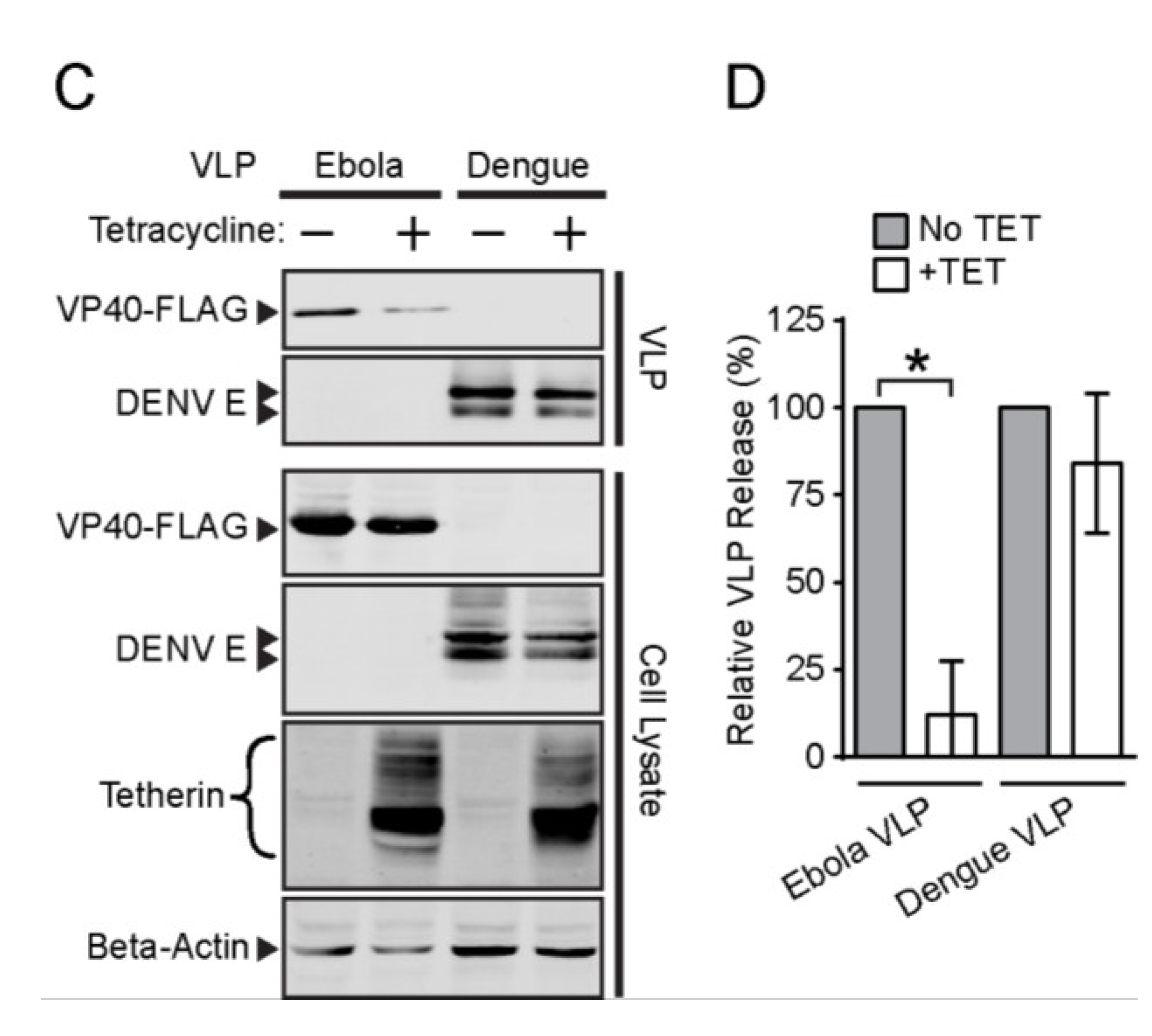 Tetherin moderately attenuates Rubella VLP release but not Dengue VLP release. (A and B) Rubella VLP release assay. HEK293T cells were cotransfected as indicated with plasmids expressing the Rubella virus structural proteins or Ebola VP40-FLAG and a tetherin-expressing construct (+) or empty vector (−). At 48 h post-transfection, VLP were pelleted, cells were lysed, and proteins in the samples quantitated by SDS-PAGE and WB; (C and D) Dengue VLP release assay. Tet-On AU1-tetherin cells were transfected with plasmids expressing the dengue virus envelope proteins or Ebola VP40-FLAG, and tetracycline added as indicated at 5 h post-transfection. At 48 h post-transfection, VLP were pelleted, cells were lysed, and proteins in the samples quantitated by SDS-PAGE and WB. Panels B and D show the efficiency of VLP release. The graphs represent the mean and SD of three independent experiments.