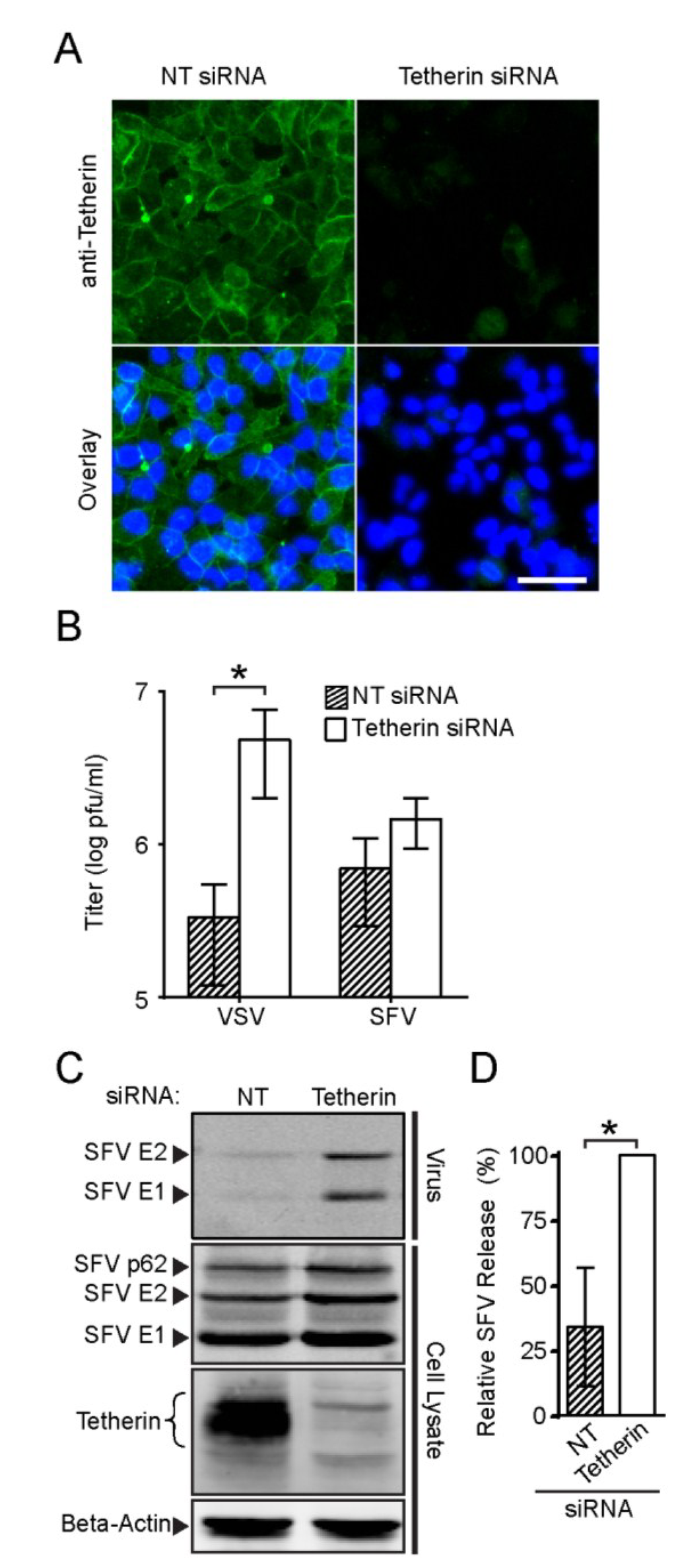 Effect of endogenous tetherin in HeLa cells on SFV and VSV release. (A) HeLa cells were transfected with non-targeting siRNA (NT) or siRNAs against tetherin, cultured for 72 h and fixed and stained as in Figure 1A. Bar = 50 µm; (B) HeLa cells were transfected as in Figure 5A, cultured for 65 h, and infected with VSV or SFV at an MOI of 10 for 6 h. Infectious virus in the culture medium was titered and graphed in a log plot; (C and D) HeLa cells were transfected as in Figure 5B and infected with SFV for 6 h. Released virus particles and cell lysate samples were analyzed by SDS-PAGE and WB (C); and the efficiency of SFV release was determined (D). The graphs in panels B and D represent the mean and SD of three independent experiments.