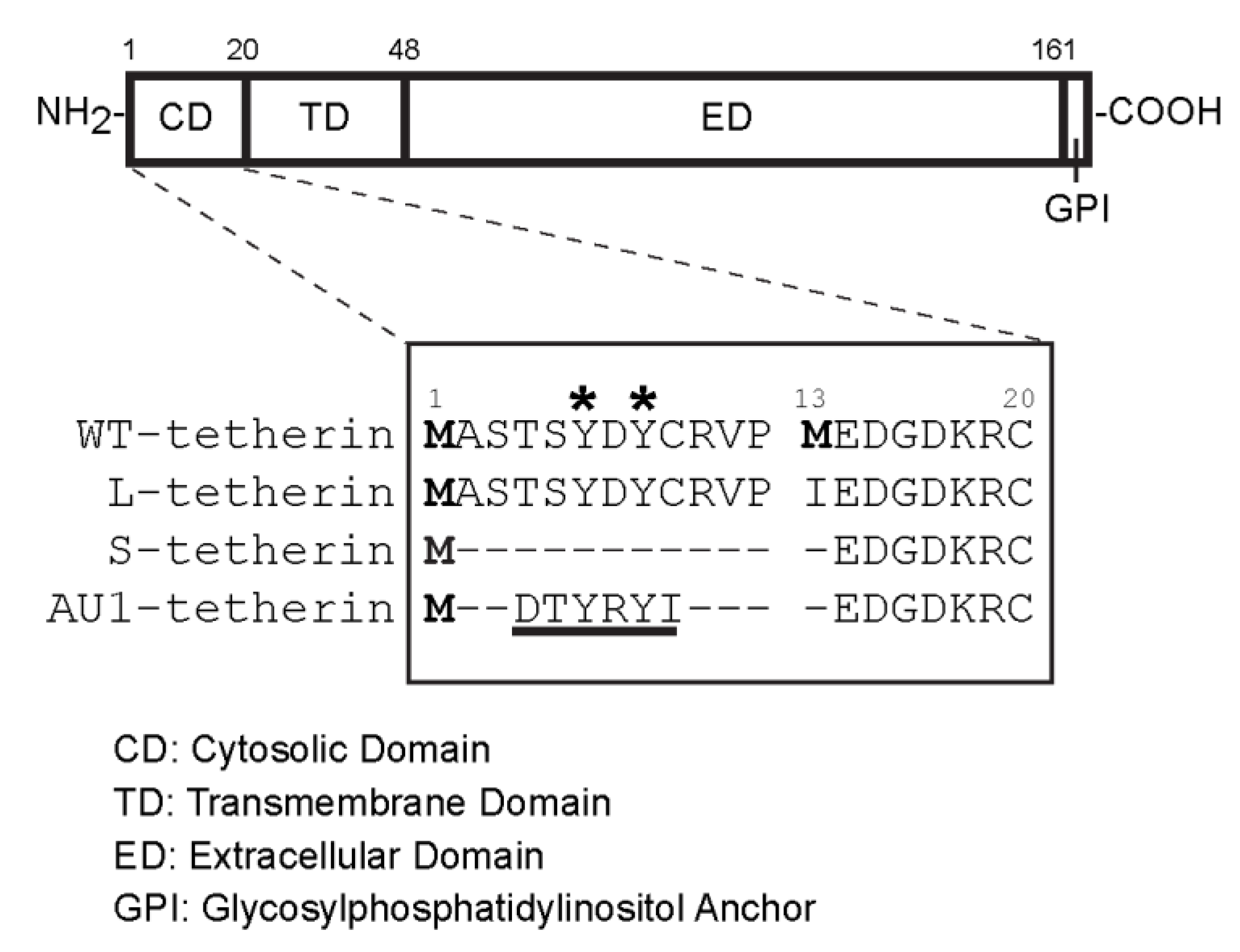 Comparison of the cytosolic domains of different tetherin constructs. A schematic diagram of the tetherin protein is shown at the top. The expanded sequence view below shows the forms of tetherin used in this study, indicated as WT (wild type), Long (L-tetherin), Short (S-tetherin), AU1-tagged (AU1-tagged S-tetherin), with numbers indicating residues in the WT sequence. Protein translation initiation sites are indicated by bolded methionine residues, and tyrosine residues responsible for the endocytosis of tetherin are indicated by *. The AU1 epitope tag containing a putative endocytosis motif is underlined.