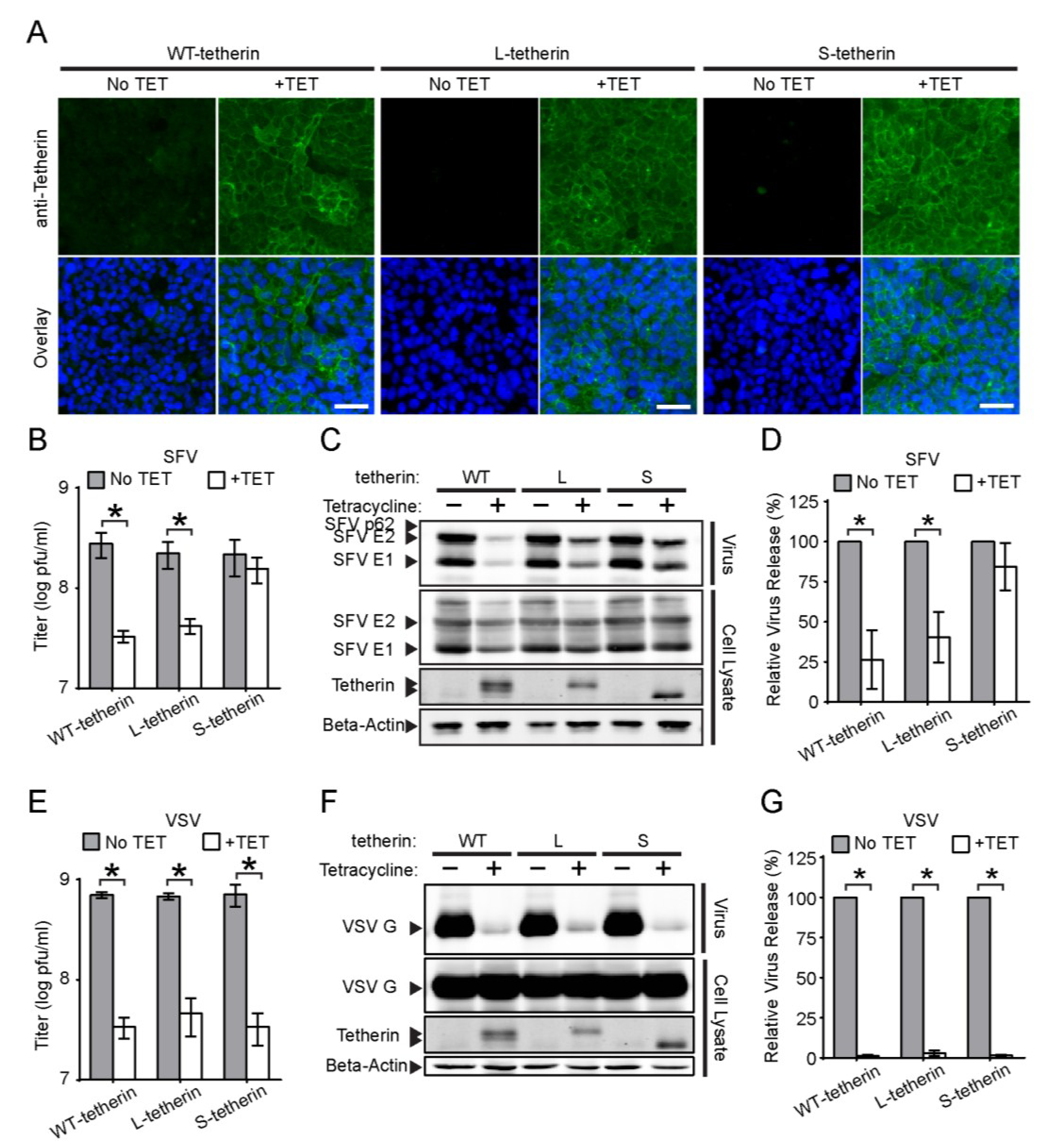 Effects of tetherin isoforms on SFV and VSV release. (A) Populations of Tet-On cells that inducibly express the long and short isoforms of tetherin (Tetherin-WT), or solely L-tetherin or S-tetherin were incubated in the presence or absence of tetracycline (TET) for 24 h. Nuclei (Blue) and cell surface expression of tetherin (Green) were detected as in Figure 1A. Bars = 50 µm; (B–D) SFV release assay. The indicated Tet-On cells were induced as in Figure 7A, and infected with SFV for 7 h. SFV particles released into the culture medium were either (B) titered or (C–D) pelleted for SDS-PAGE,WB and quantitation of release as in Figure 2. Tetherin isoforms were detected by WB; the gel shows the migration of the tetherin dimers. (E–G) VSV release assay, performed, titered (E), analyzed (F) and quantitated (G) as in B–D using a mAb to VSV-G. Graphs represent the mean and SD of three independent experiments. Note that all titers are graphed in a log plot.