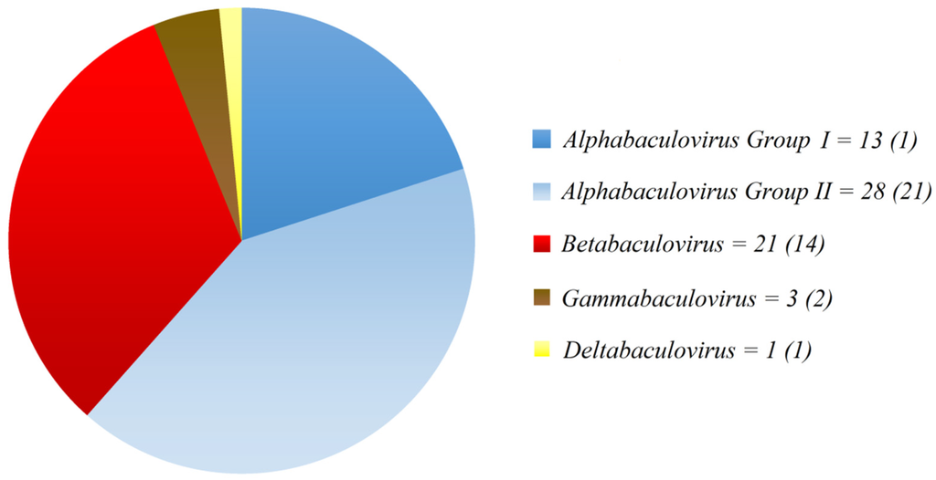 Baculoviridae. The numbers of putative species in each of the four genera are based on the species accepted by the International Committee on Taxonomy of Viruses, ICTV (numbers in parentheses) plus other baculoviruses that are not recongnized as species yet, but the information published to date suggest their inclusion in the near future as separate species according to the species demarcation criteria adopted by ICTV [,,]. Redundant genomes were excluded and the more recently sequenced Erinnyis ello granulovirus [], Agrotis segetum NPV-B [], Spodoptera frugiperda GV [], and Pseudoplusia includens SNPV [], among others, were added. As an alternative to complete genome information, species can be defined following the demarcation criteria set forth in []. The graph shows the Alphabaculovirus genus divided in groups I and II, based on the active fusogenic protein present in the BV.