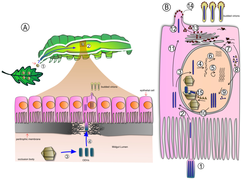 Baculovirus infectious cycle. (A) Cross sectional schematic of an insect larva. A baculovirus occlusion body (OB) ingested with contaminated food starts a new infectious cycle (1). When OBs pass through the foregut and reach the alkaline midgut the proteinaceous matrix is dissolved (2), releasing ODV (3). The peritrophic membrane is degraded by virus and host encoded enzymes present in the OB (4), allowing the ODV to enter the cell; (B) Representation of the virus replication cycle. ODV enters the cell by fusion with epithelial cell microvilli (1), releasing nucleocapsids (NC) into the cytoplasm (2). NC may enter the nucleus (3), disassemble and release the genome (4). Then early genes are transcribed (6) and translated (7). Some of the proteins translocate into the nucleus (8), take part in genome transcription/replication, NC and virion assembly (9). In the first stages of viral infection, NC is transported to the cytoplasm (10), approaches the basolateral cell membrane (CM) (11) and emerges as budded virus (BV) (12) in the spots where the viral envelope fusion protein (EFP) (14) accumulates using the secretory pathway (13). In the very late stages of infection, NC are enveloped in the nucleus and occluded in the polyhedral shaped protein matrix (OB) (15) (adapted from [], copyright 2013, The Authors).
